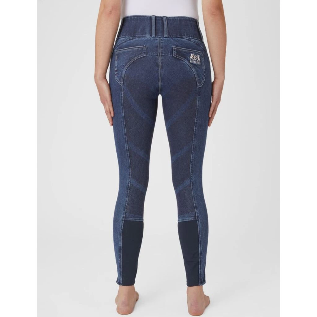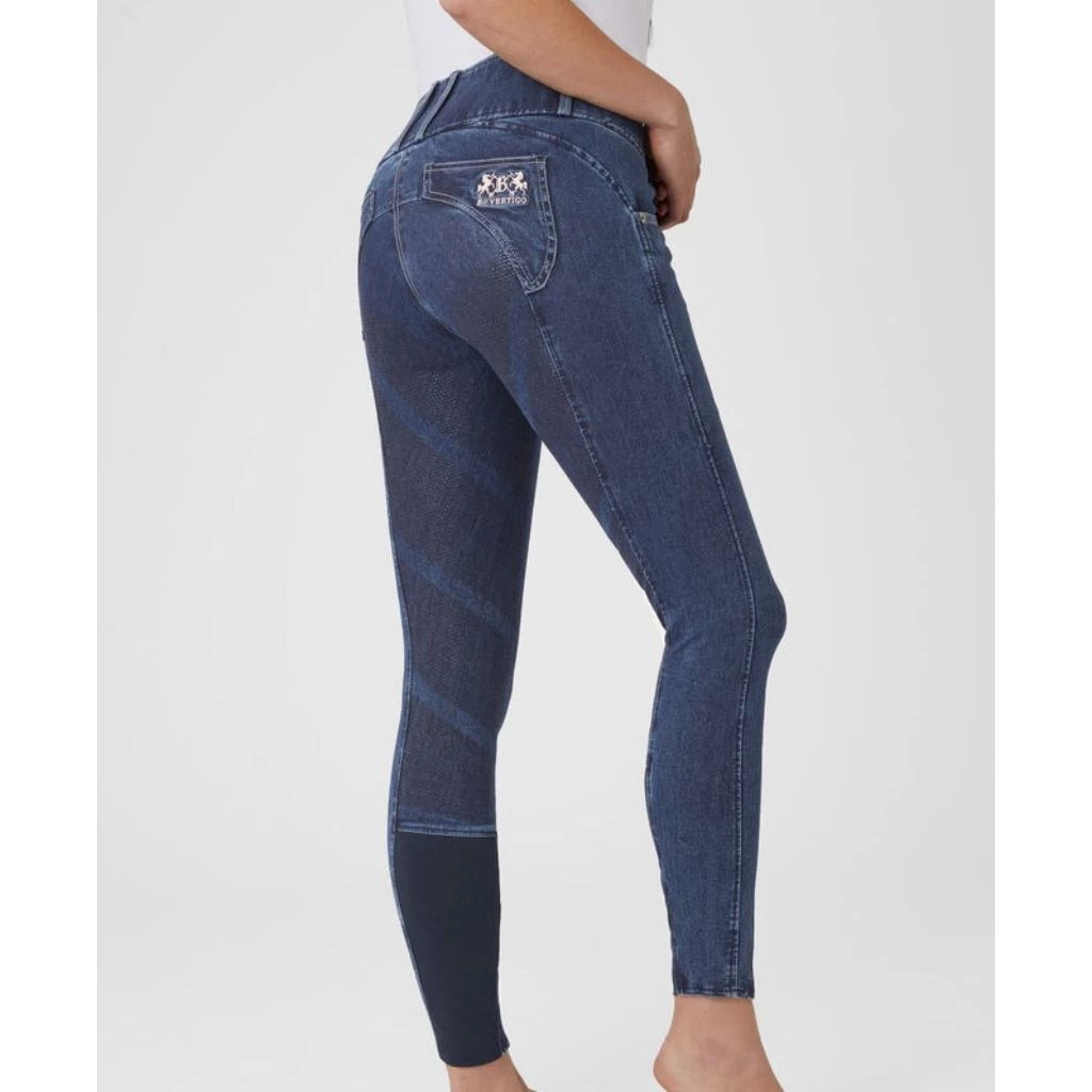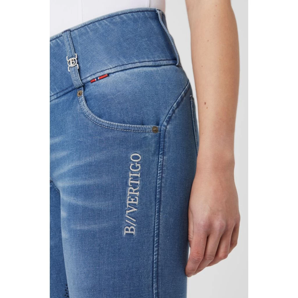 The B Vertigo Dianne breeches are made from soft, water and dirt repellent denim material. The high waist keeps them in place, and the silicone full seat keeps you in the saddle. Belt loops, 3 button closure and contrasting seams around pockets and belt loops add to the typical jeans look. Breathable fabric keeps you cool while riding or in the stables. Subtle B Vertigo embroidery adds a chic detail.