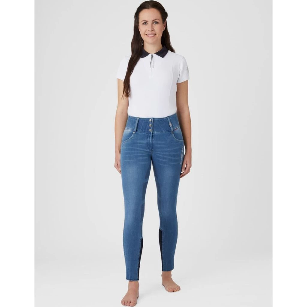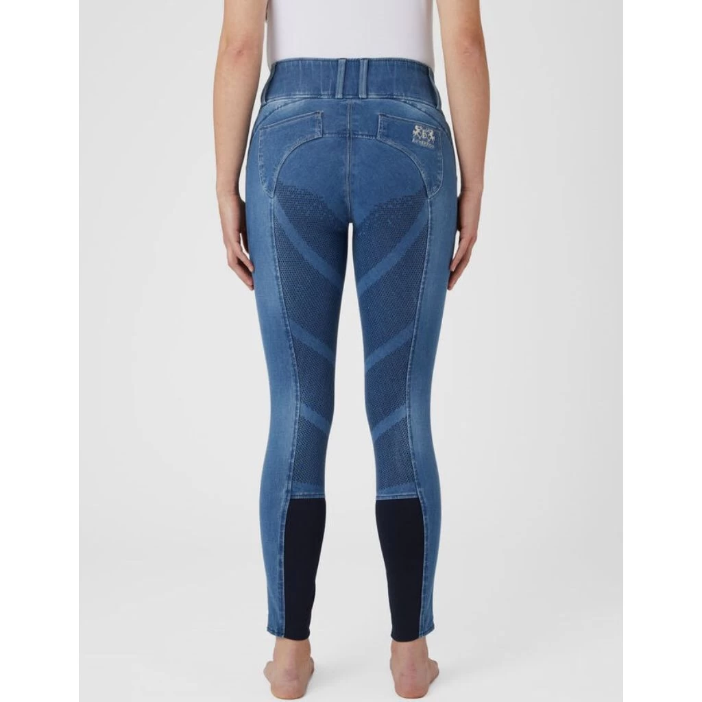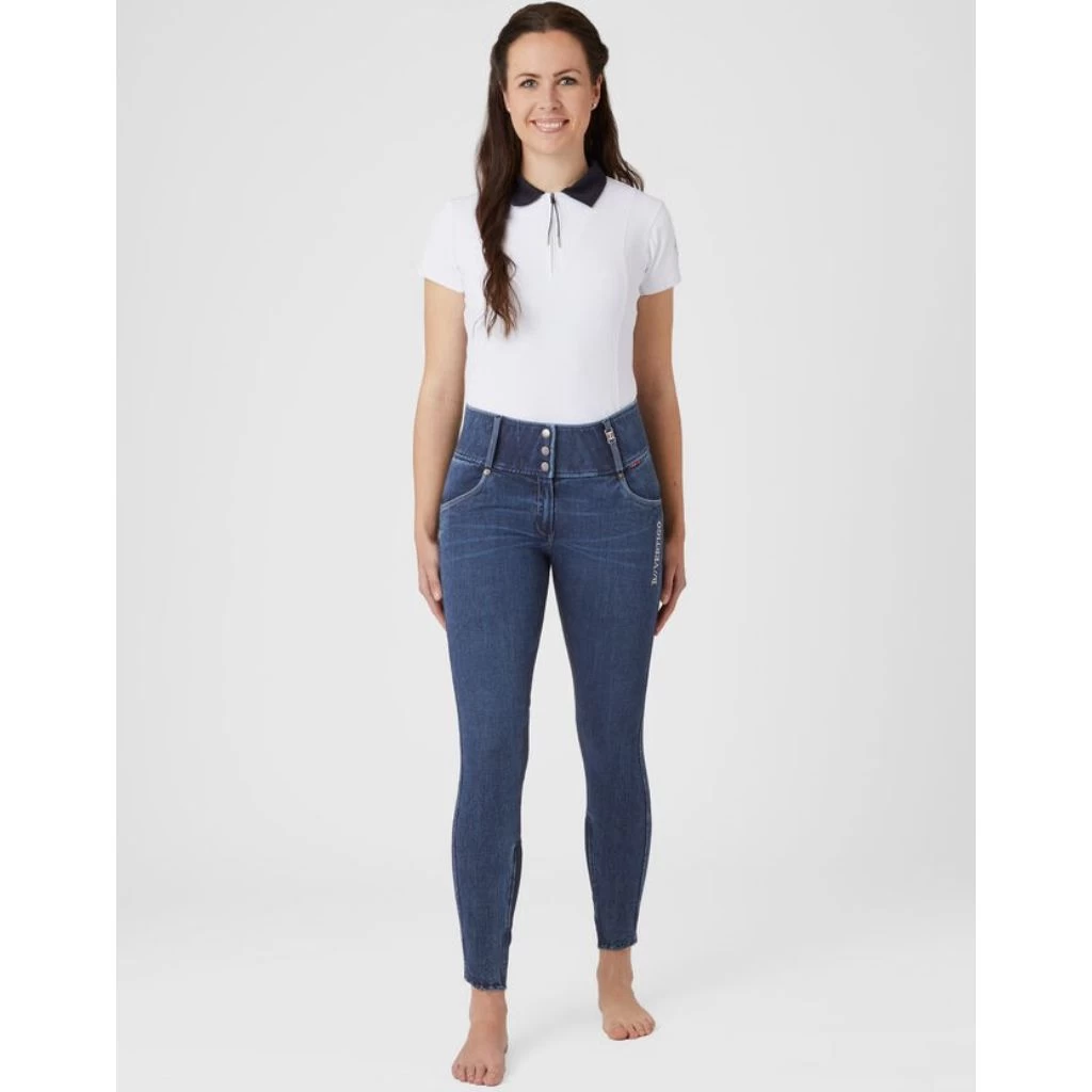 The B Vertigo Dianne breeches are made from soft, water and dirt repellent denim material. The high waist keeps them in place, and the silicone full seat keeps you in the saddle. Belt loops, 3 button closure and contrasting seams around pockets and belt loops add to the typical jeans look. Breathable fabric keeps you cool while riding or in the stables. Subtle B Vertigo embroidery adds a chic detail.