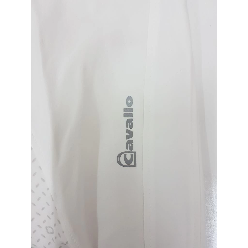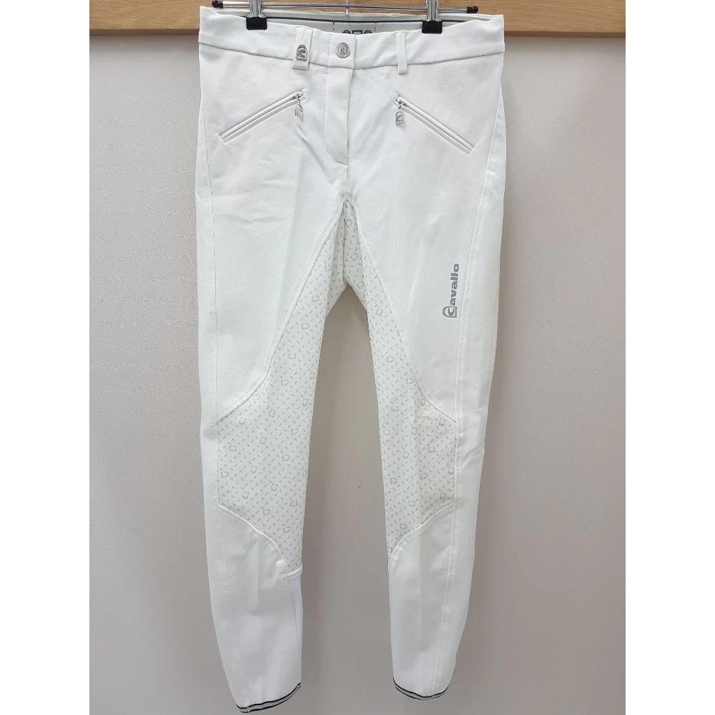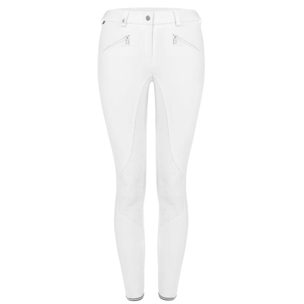 Cavallo Caja Full Seat Competition Breeches in White. Sporty, luxurious and elegant competition breeches. A special cut knee area allows for extra grip along with a full seat design to keep you still in the saddle. Practical zipped front pockets perfect for treats or a phone and an insert at side for wearing comfort.