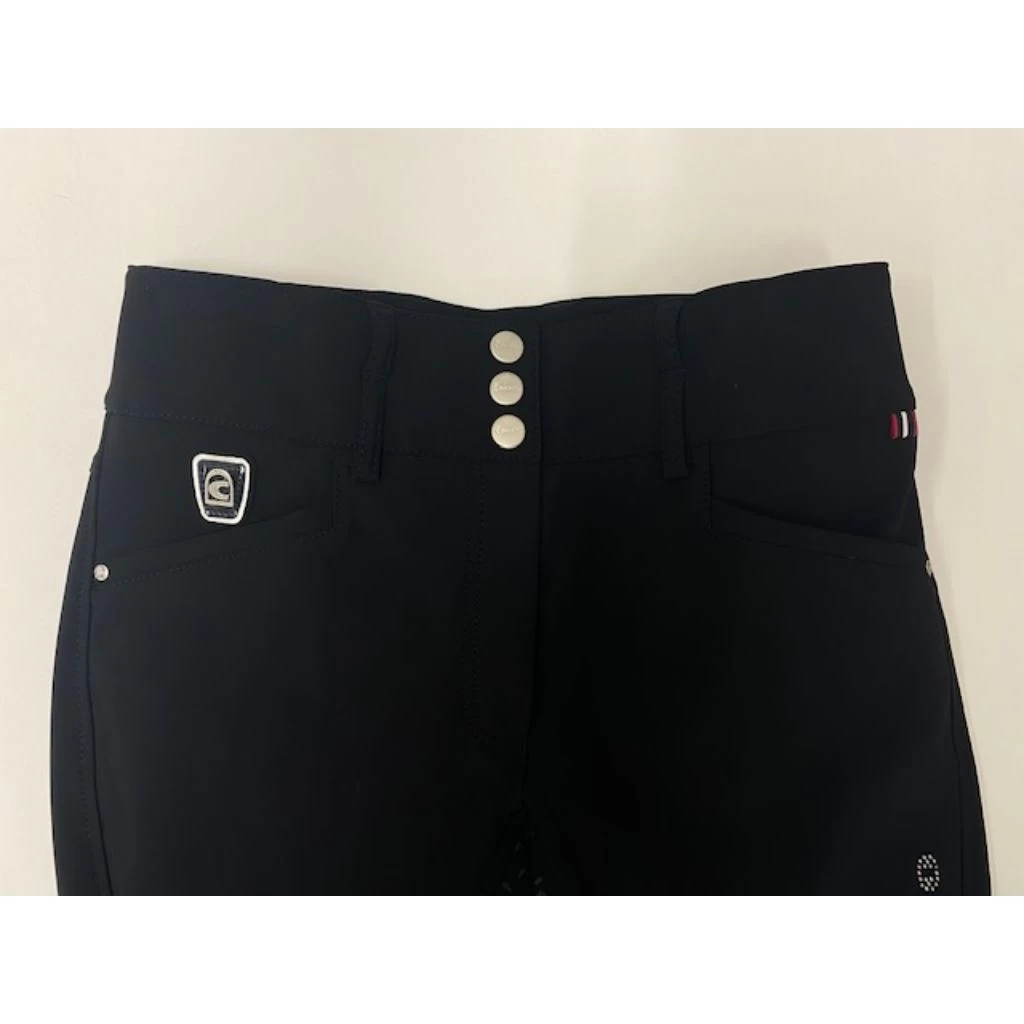 - Elegant breeches with an extra wide waistband and three buttons.