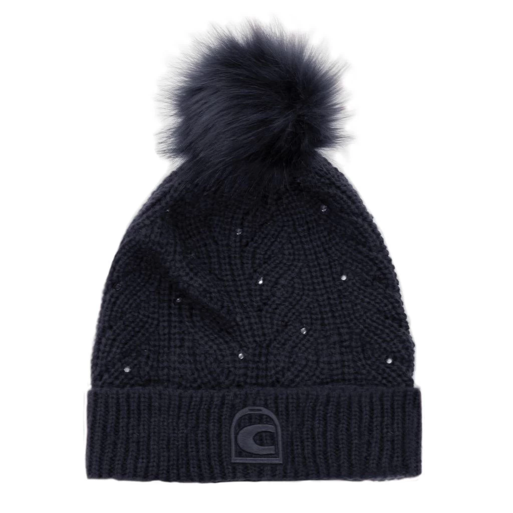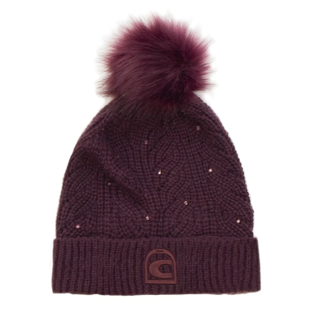 A cable-knit design and tonal faux fur pom-pom available in Navy and Wine. Tonal crystals underline the elegance of the hat. Elegant, tonal, slightly shiny logo embroidery on the front left brim. Inside fully lined with soft fleece.