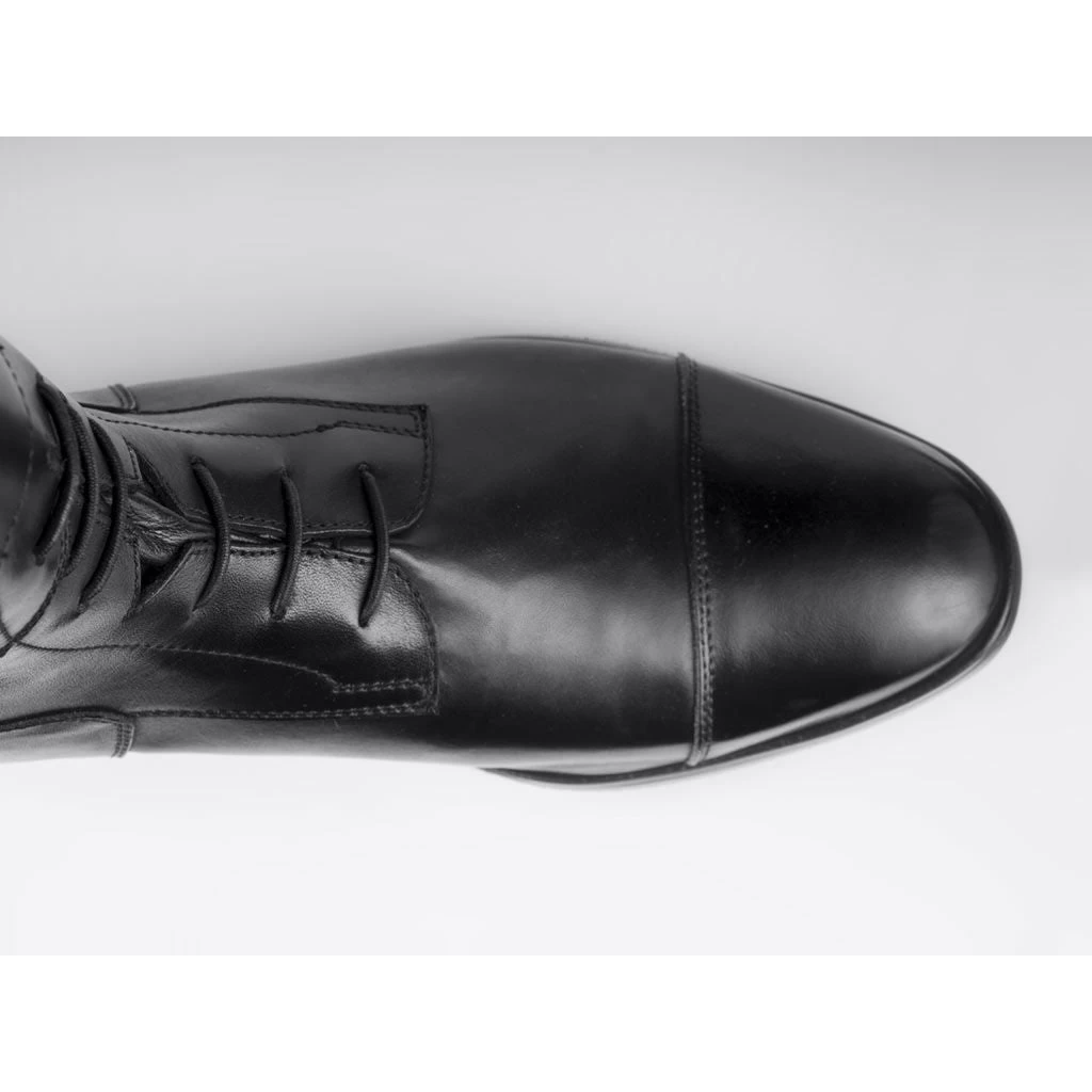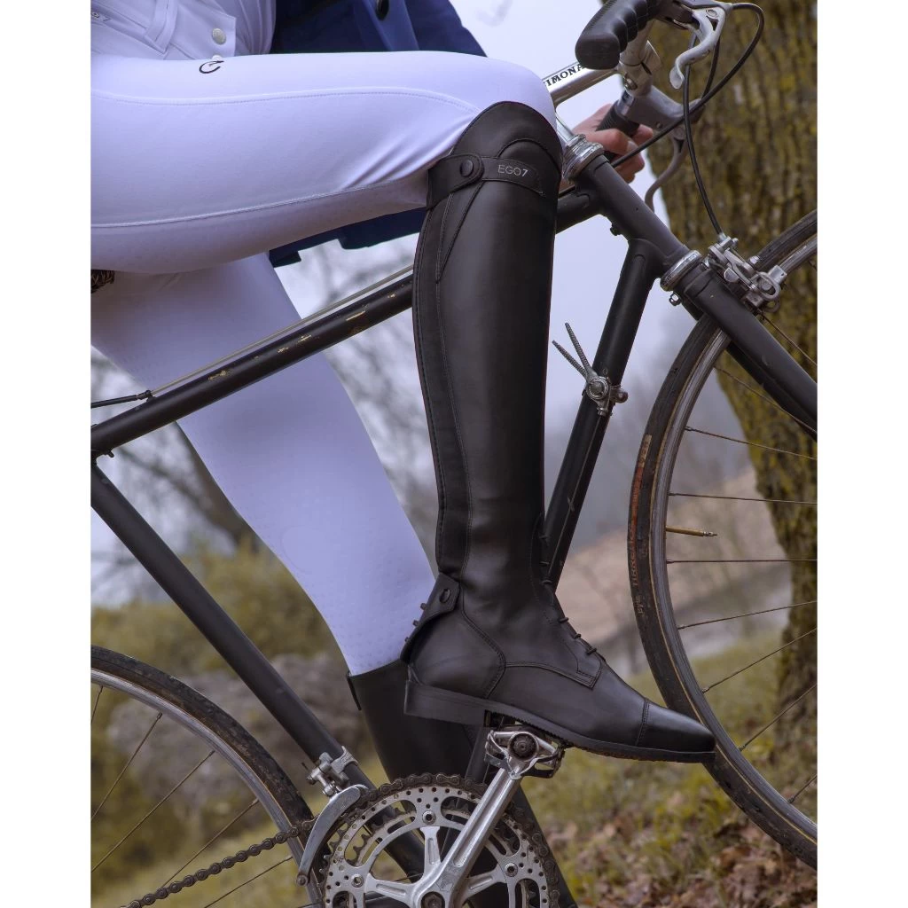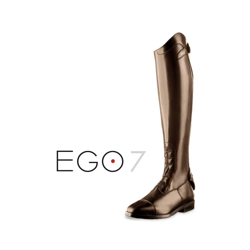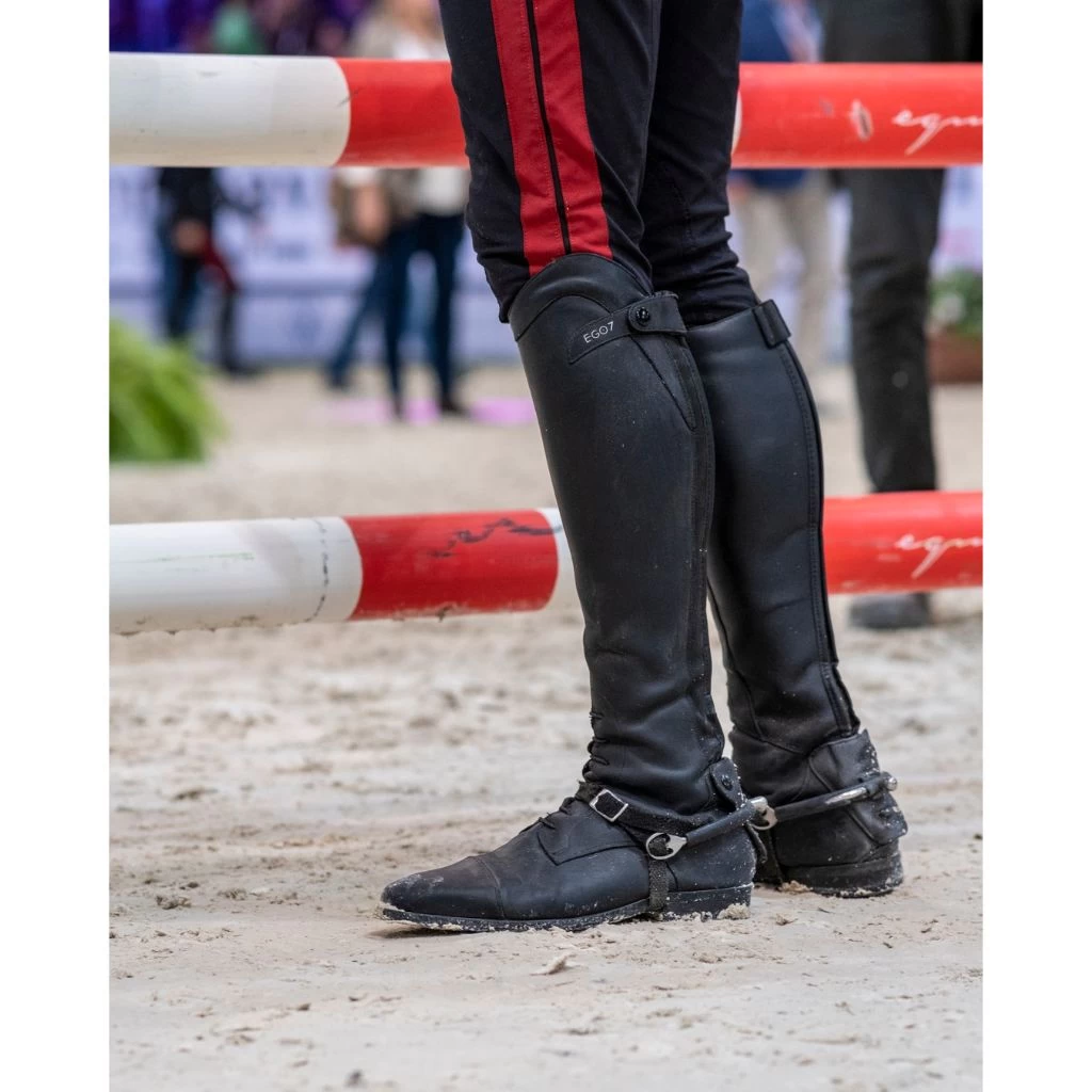 EGO7 Orion, tall riding boots with a modern design and high-end style, lace-up jumping boots made from full grain leather with elastic laces detail and extra-soft leather front. All EGO7 models have a rear elastic band. This ensures maximum comfort, freedom of movement and a glove-like, made-to-measure fit -and look- to any calf, together with extreme wear resistance and easy care of the innovative E-tex material. The full-length panel protects effectively the inner calf and guarantees a perfect contact with the horse.