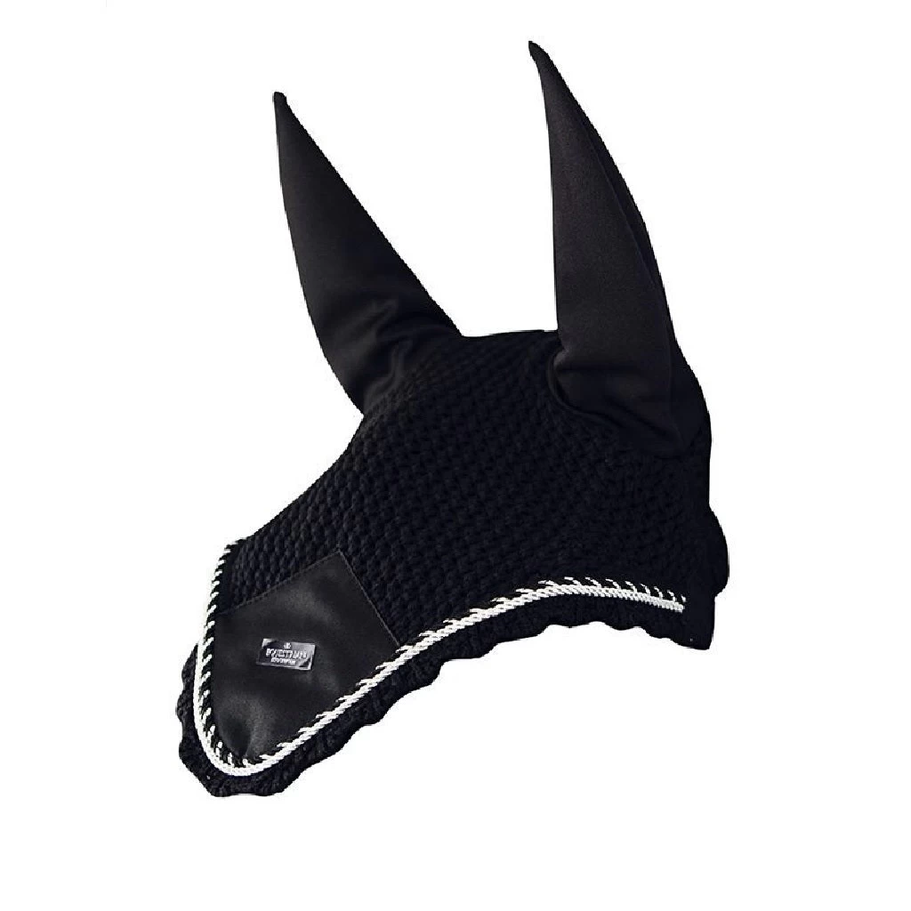 Luxurious ear net in black with black and silver piping and metal badge in silver.
