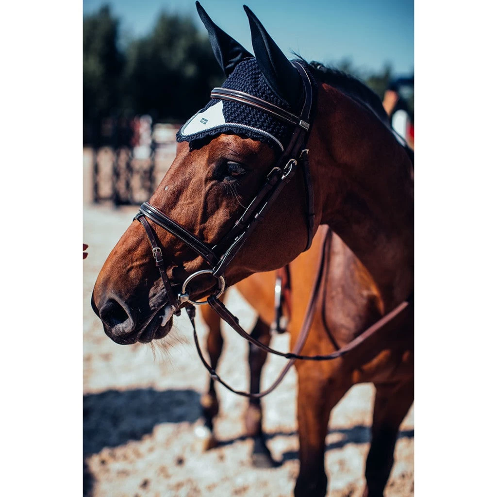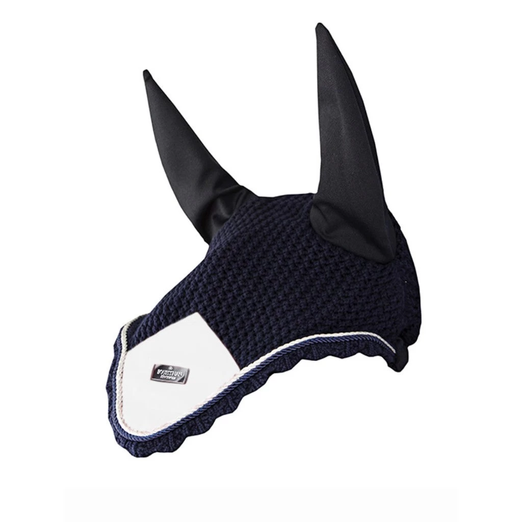 Luxurious ear net in navy and white with piping and metal badge in silver.