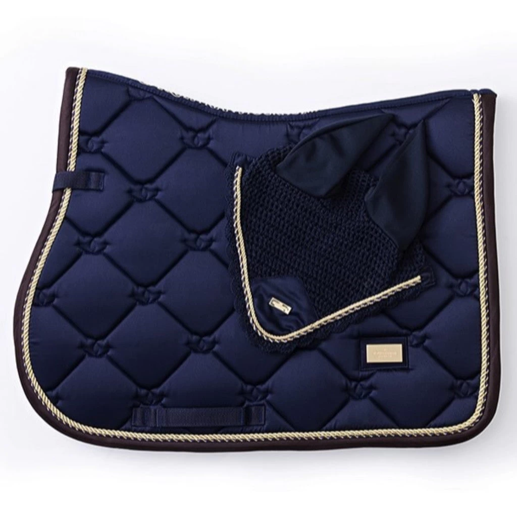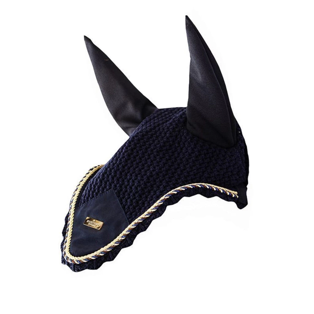 Luxurious ear net in navy with brown and gold piping and metal badge in gold.