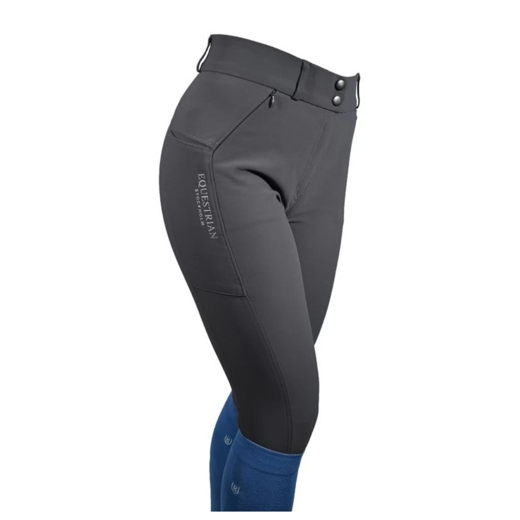 Our brand new riding breeches comes in 4-way stretch material and a wider size range. Exclusive dressage riding breeches designed in medium dark grey. Styled with Equestrian Stockholm’s logo in silver. With full grip, comfortable mobile pockets and super soft fabric, these will be your go-to-piece. Full seat silicon grip to keep you steady in the saddle. Style with other pieces from our Parisian Blue collection for a complete look.