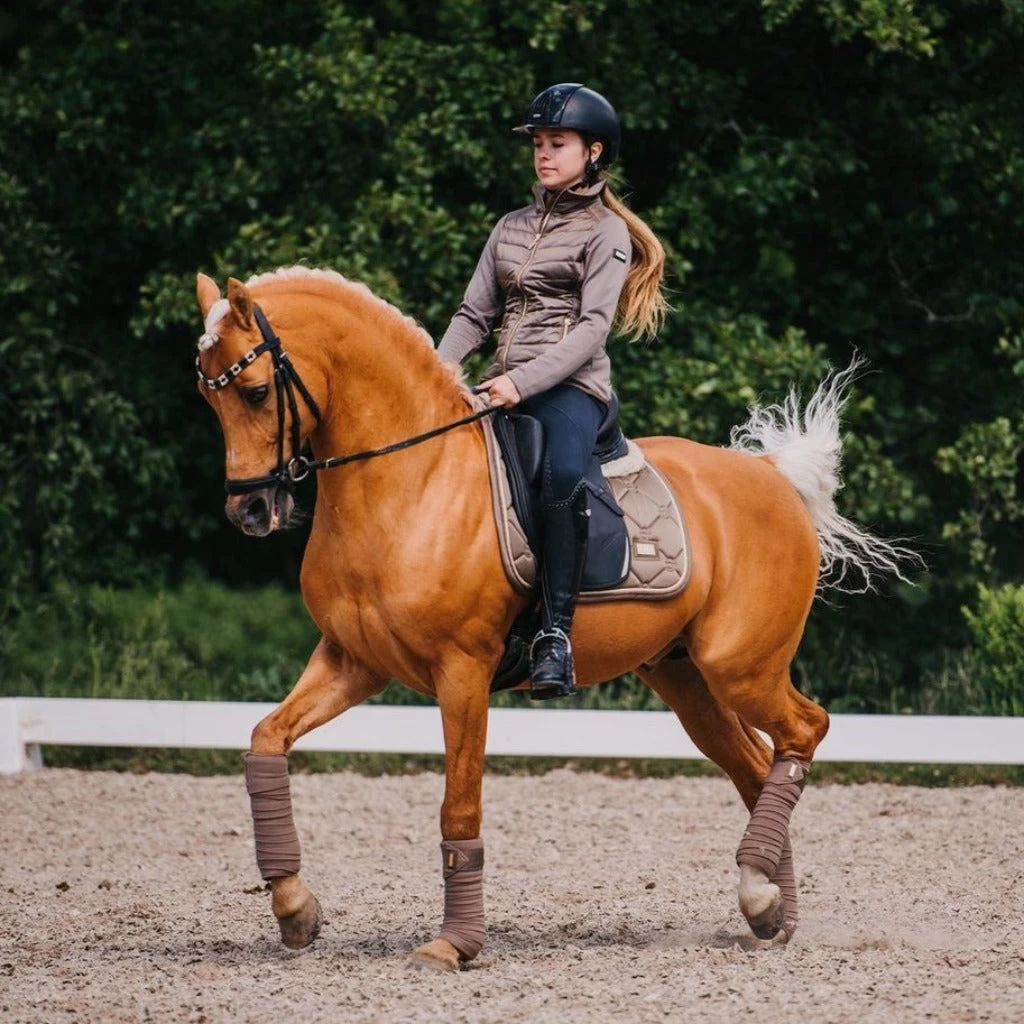 The saddle pad has ‘super quick dry’ inner material and shiny dirt repellant outer material with beautiful details in gold and patterns with the Equestrian Stockholm logo.