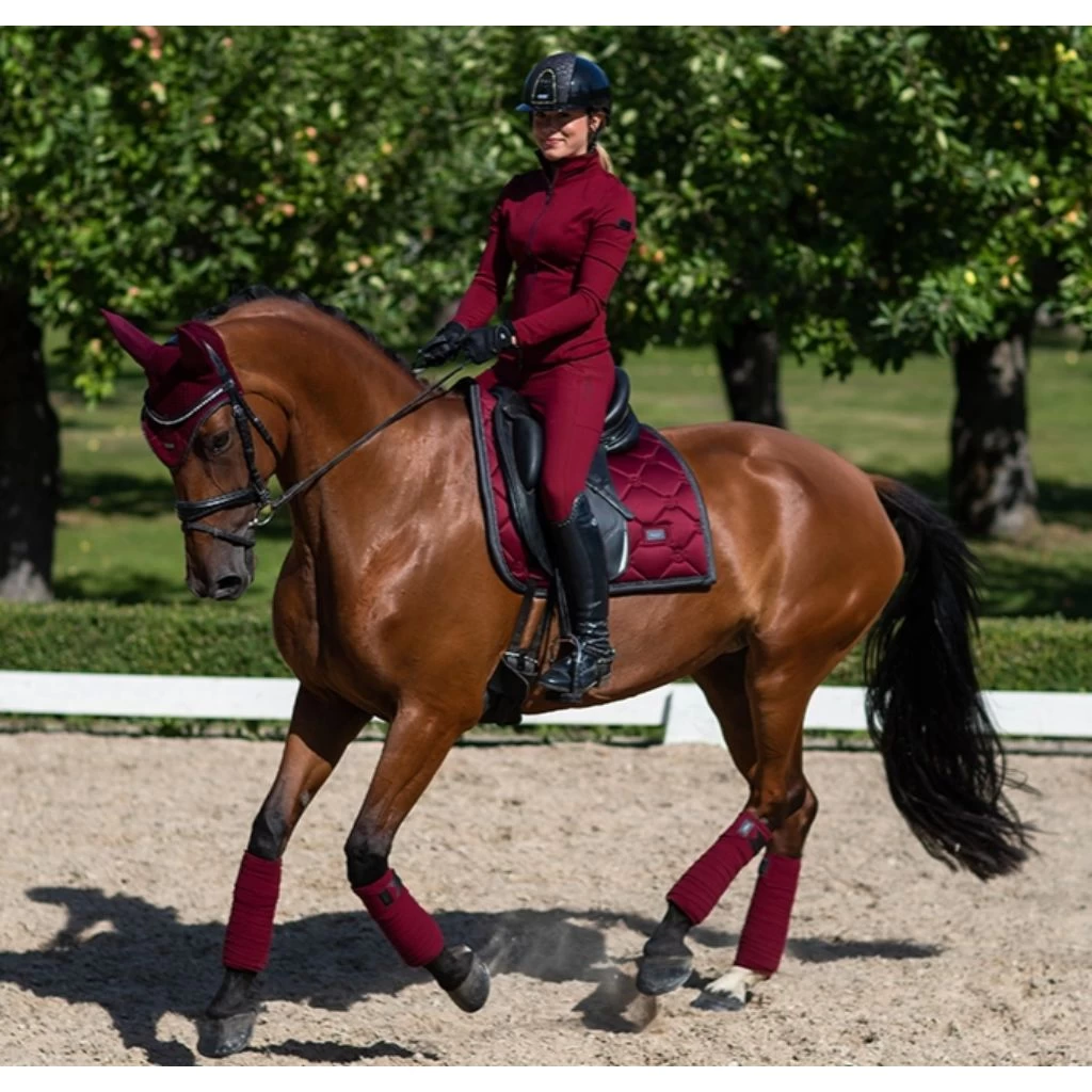Elegant saddle pad in a deep red colour with black and dark grey details. Decorated with the Equestrian Stockholm badge in chrome. The bamboo material is perfect all year round due to its thermal regulating effect – cooling in the Summer and warming in the Winter. It is also quick dry, moisture wicking, and anti-bacterial. Style with other pieces from the Dark Bordeaux collection or our classic Bordeaux collection for a head-to-toe stylish look.