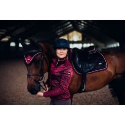 Glamorous saddle pad in a romantic nuance of merlot, with shimmering golden crystals and merlot piping. Crafted in an exquisite fabric, that’s glossy, dirt repellent and breathes well. Decorated with the iconic Equestrian Stockholm badge in gold. Created with anatomic shape, and quilting in Equestrian Stockholm’s pattern. Style with other pieces from the same collection for a head-to-toe glamourous look.