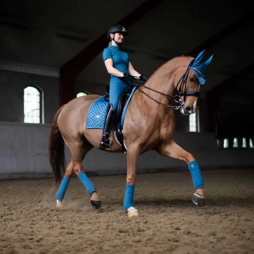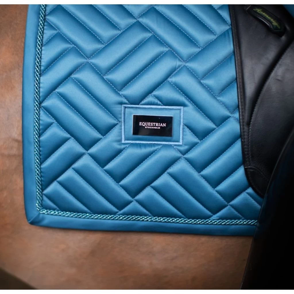 Elegant saddle pad with modern maze quilting in a blue color with silver and white details. Decorated with the Equestrian Stockholm badge in silver. The bamboo material is perfect all year round due to its thermal regulating effect – cooling in the Summer and warming in the Winter. It is also quick dry, moisture wicking, and anti-bacterial. Style with other pieces from the Amalfi collection for a head-to-toe stylish look.