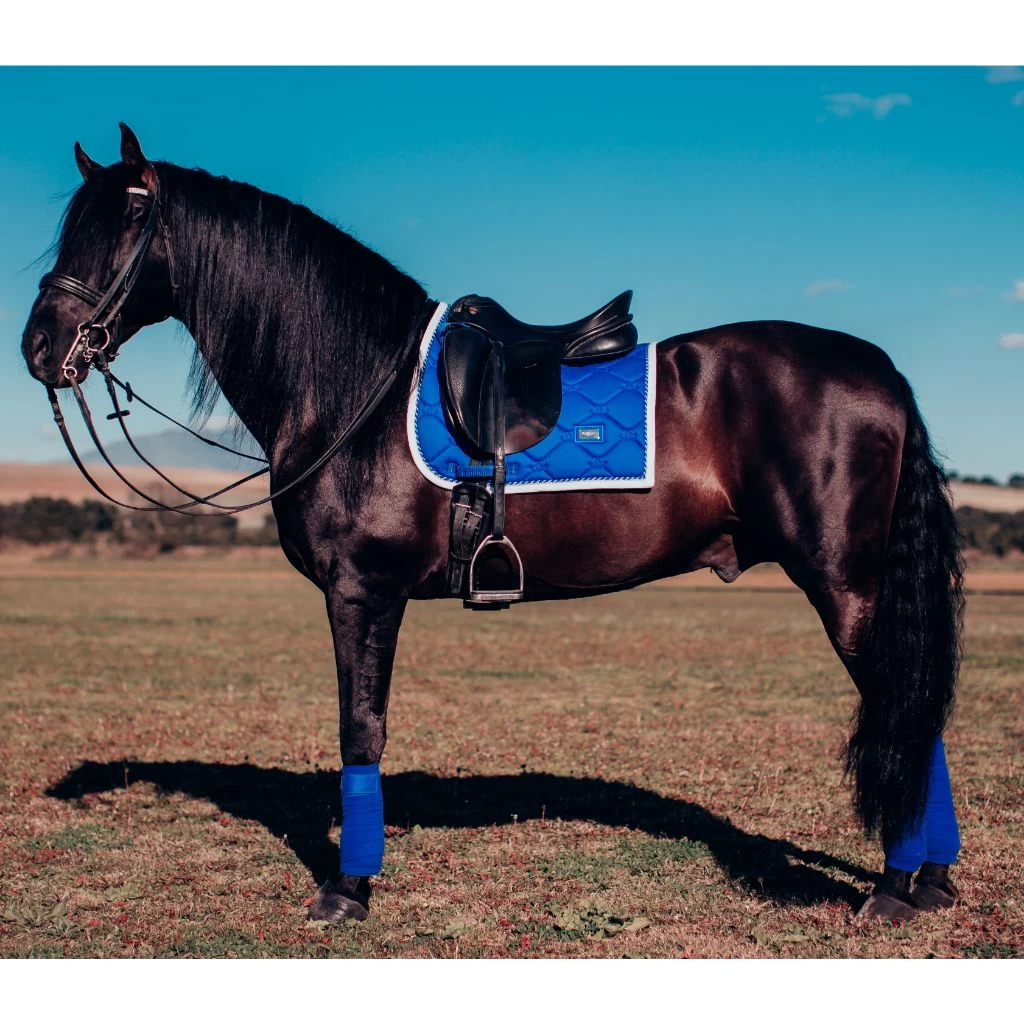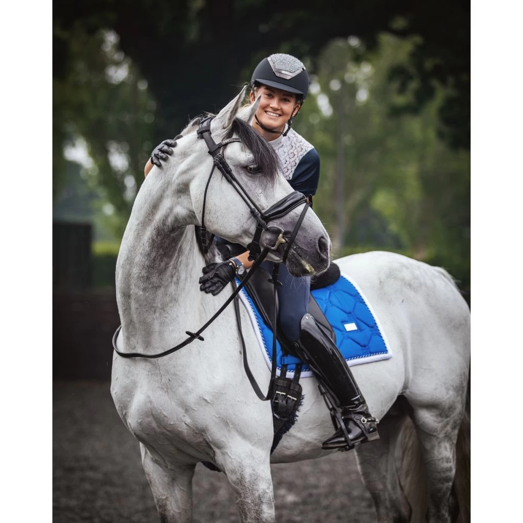 Fresh blue color with white binding and beautiful details in silver. Quilted in patterns with Equestrian Stockholms luxurious logo.