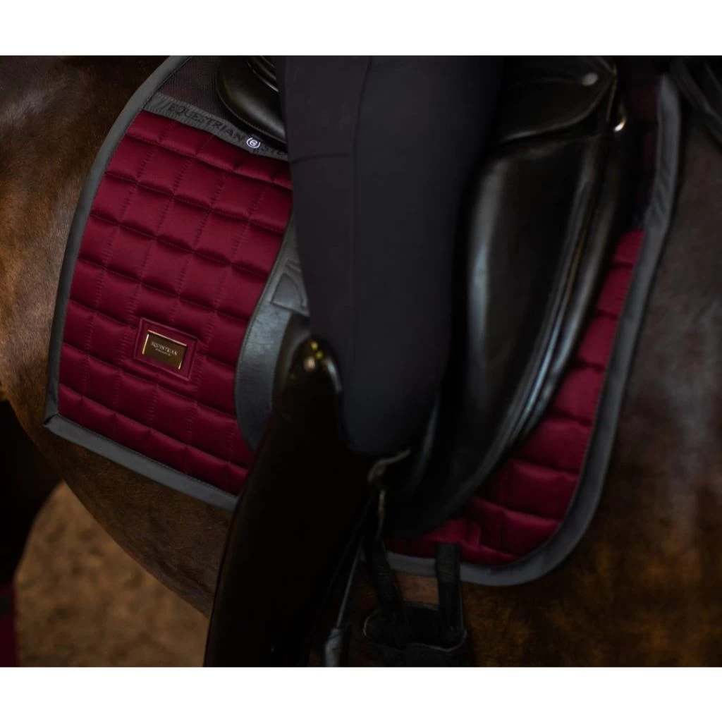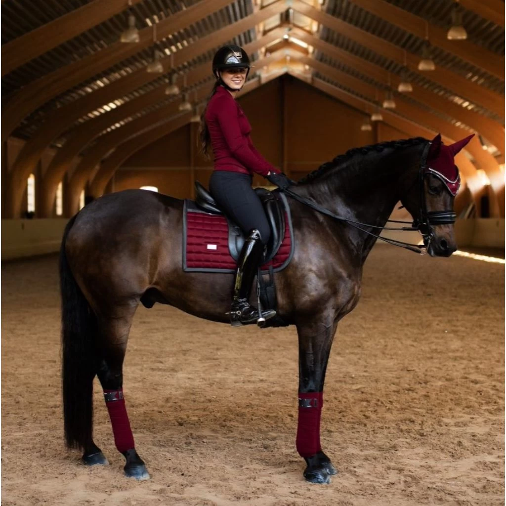 Sportive saddle pad in a deep red colour. Designed with black decorative mesh and Equestrian Stockholm badge in chrome. The bamboo material is perfect all year rounddue to its thermal regulating effect – cooling in the Summer and warming in the Winter. It is also quick dry, moisture wicking, and anti-bacterial. Style with other pieces from the Sportive Dark Bordeaux collection for a head-to-toe stylish look.