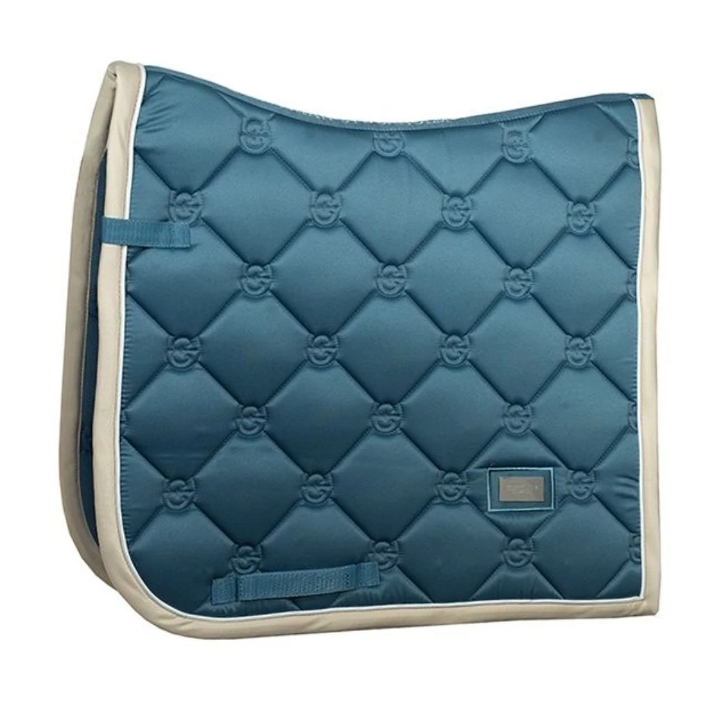 Elegant saddle pad in a light blue color with beige and white details. Decorated with an Equestrian Stockholm badge in silver. Style with other pieces from the Stone Blue collection for a head-to-toe stylish look.