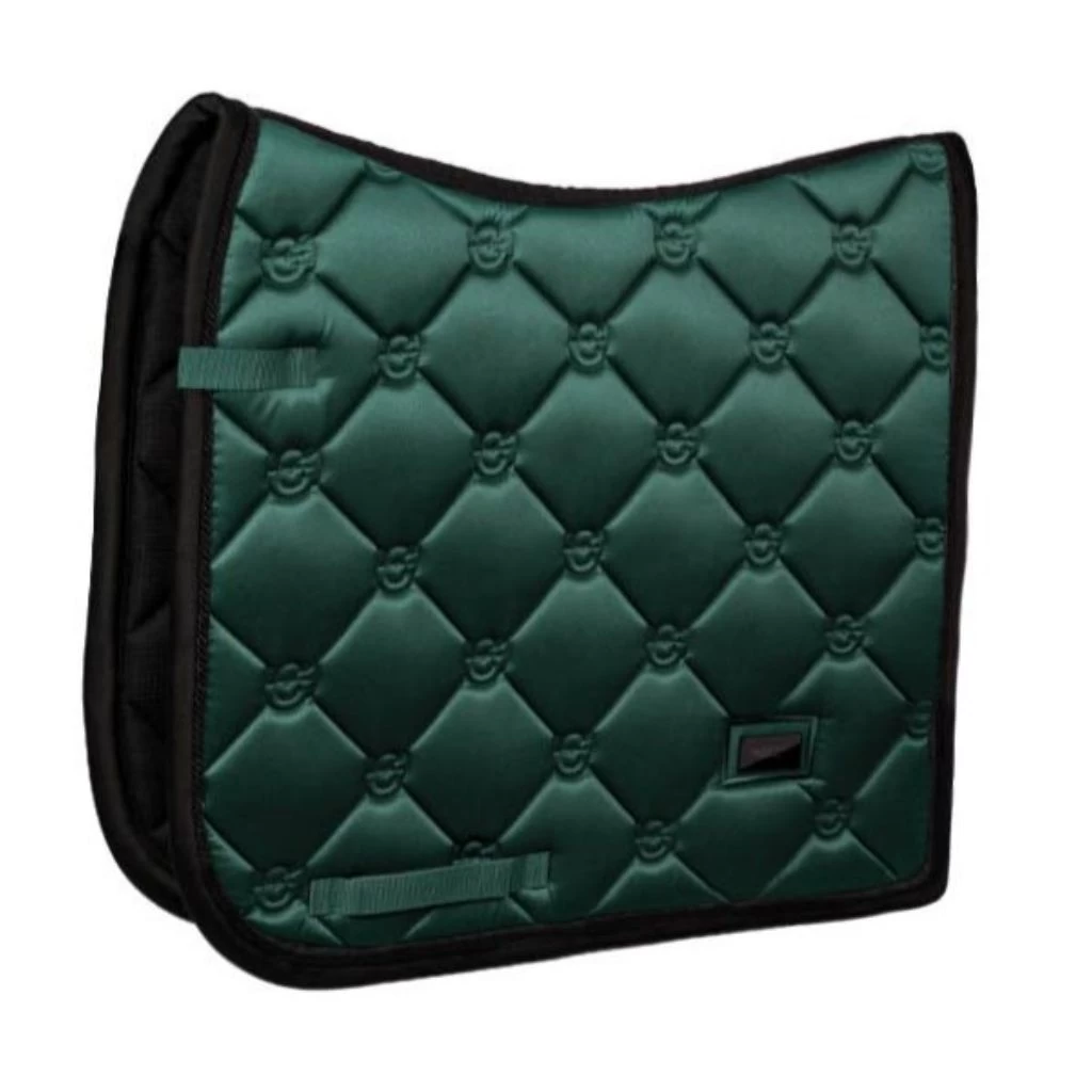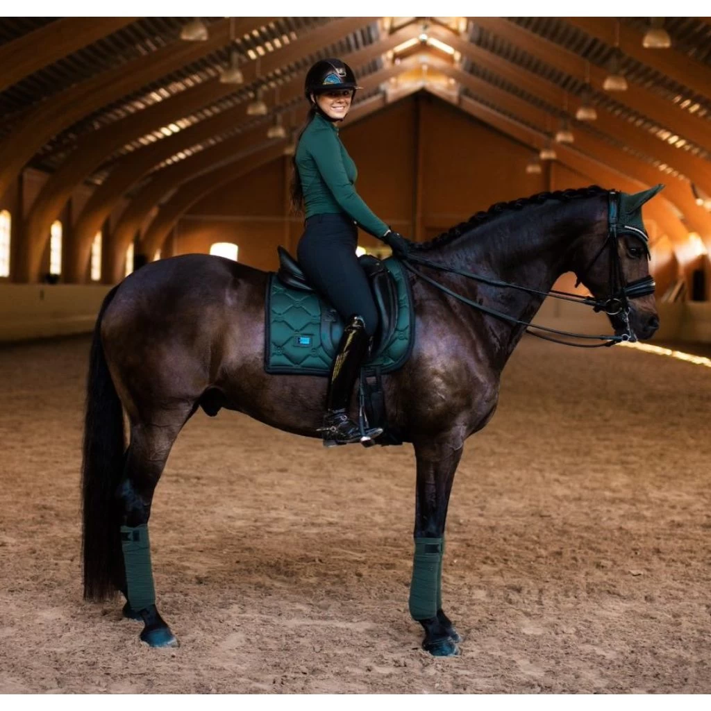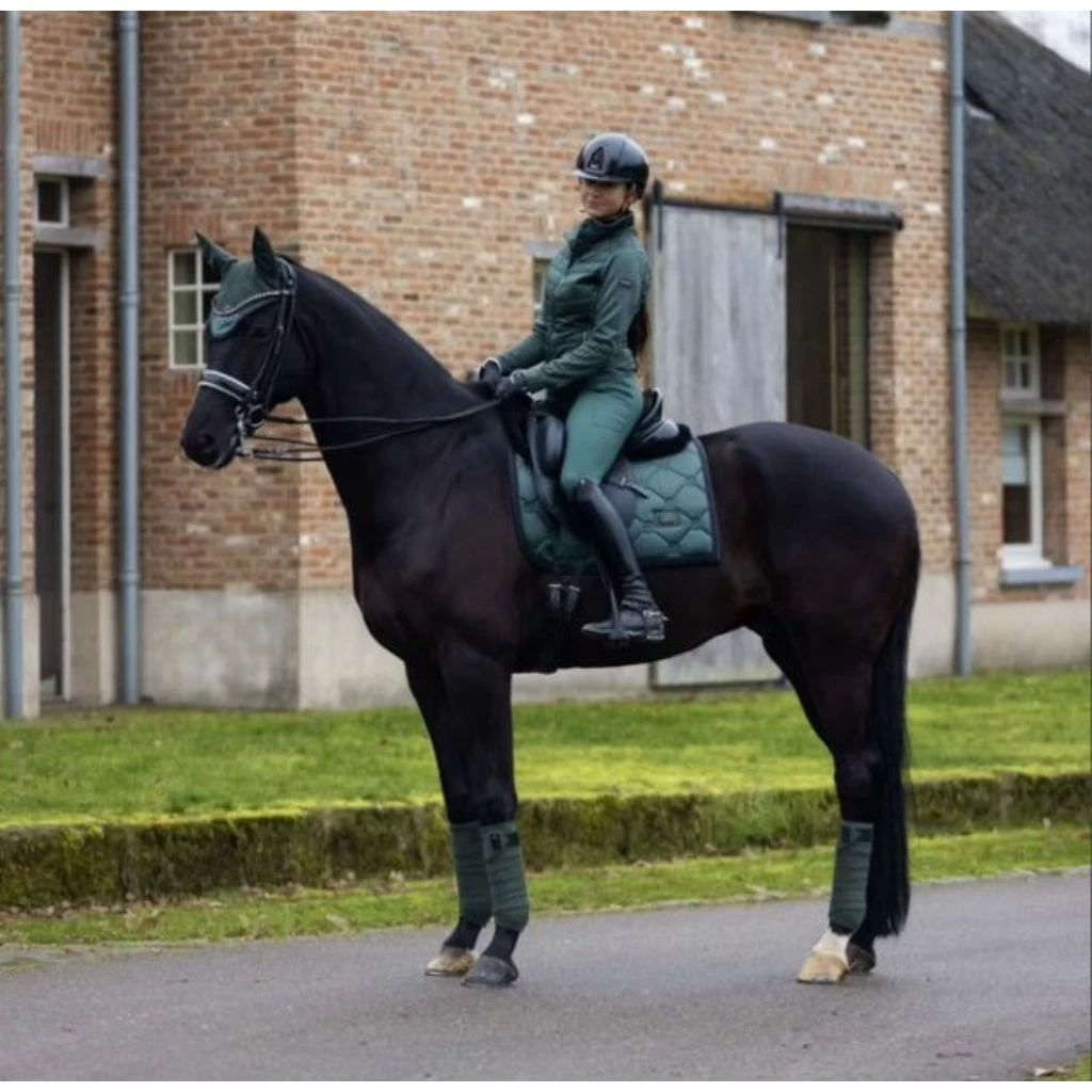 Elegant saddle pad in a cool dark green colour with black and chrome details. Decorated with the Equestrian Stockholm badge in black. The bamboo material is perfect all year round due to its thermal regulating effect – cooling in the Summer and warming in the Winter. It is also quick dry, moisture wicking, and anti-bacterial. Style with other pieces from the Sycamore Green collection for a head-to-toe stylish look.