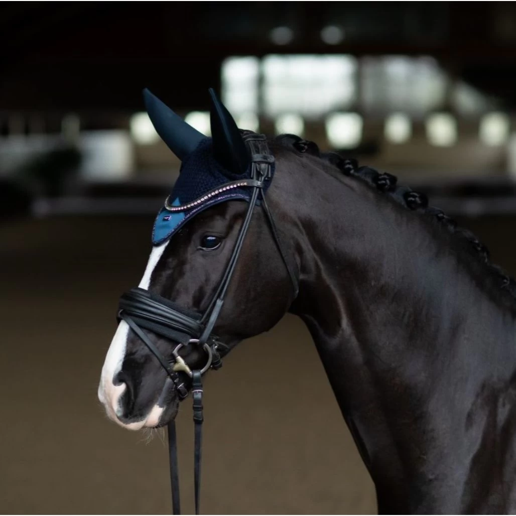 Luxurious crocheted ear net in a stylish navy blue colour. Decorated with a blue satin patch on the front, beautiful piping and the edge border in navy blue. Styled with Equestrian Stockholm badge in dark blue. The bonnet provides both insect protection and noise reduction. It has elastic cloth on the ears for extra comfort. Matches perfectly with the saddle pad from the Blue Meadow collection.