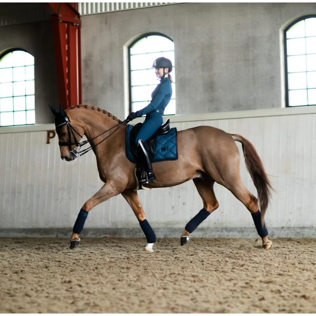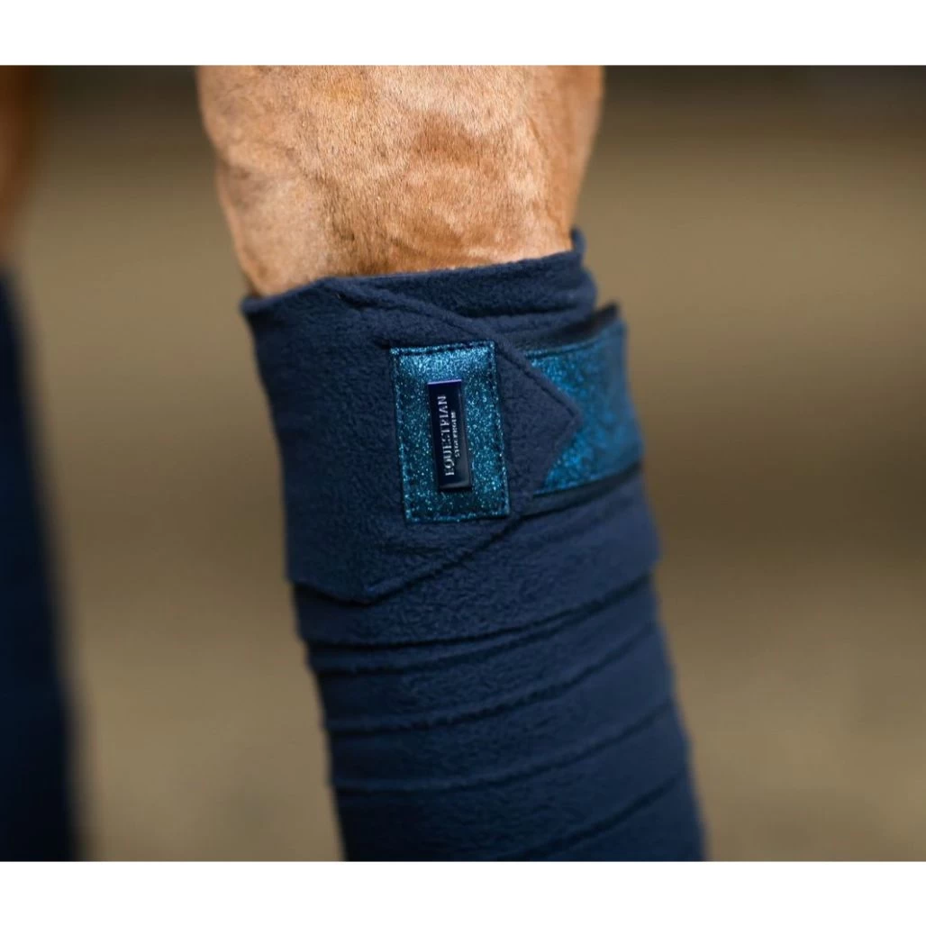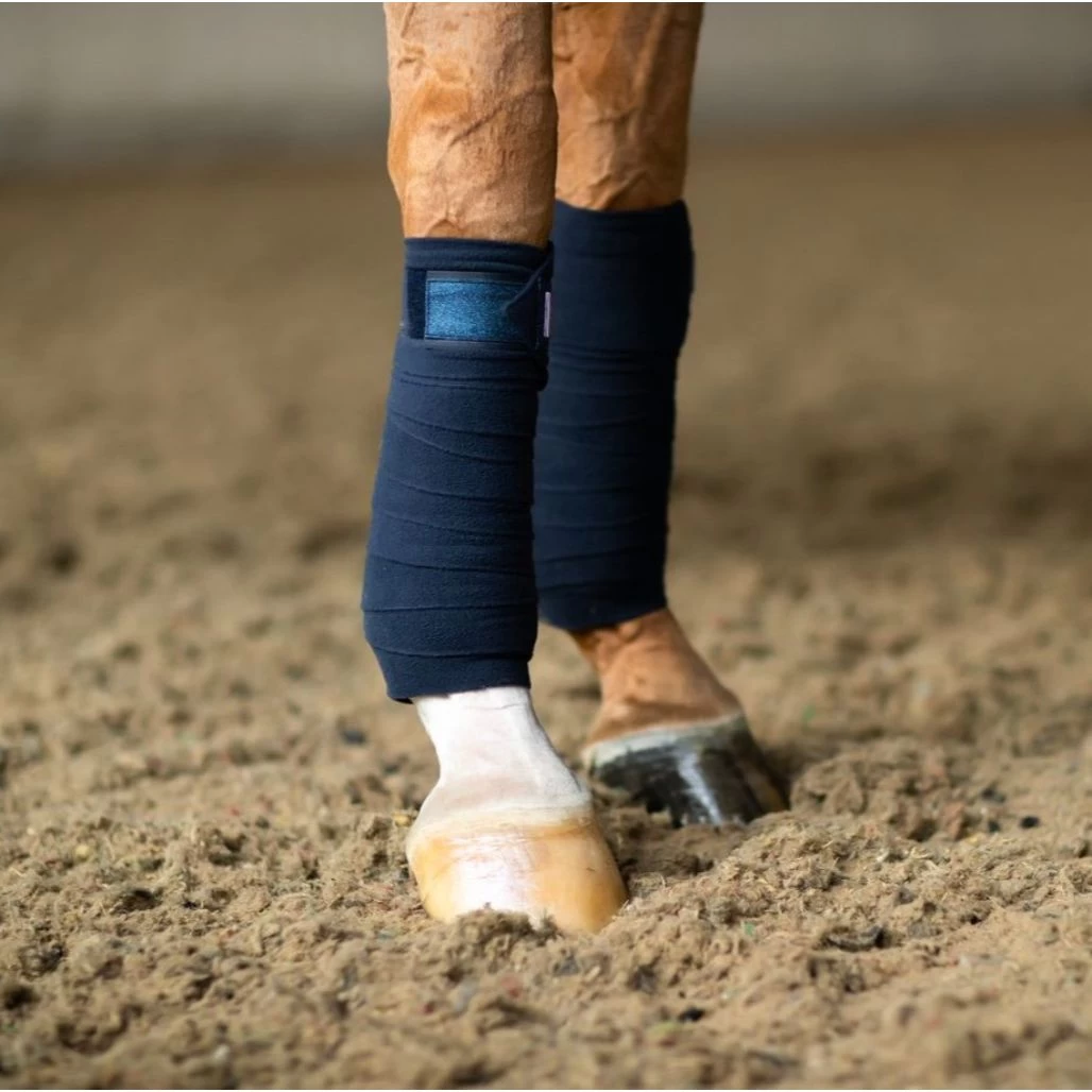 High quality fleece bandages in a stylish blue colour. Decorated with navy blue satin details and an Equestrian Stockholm badge in dark blue. Style with the saddle pad and ear net from the Blue Meadow collection to complete a glamorous look. Sold in sets of four.