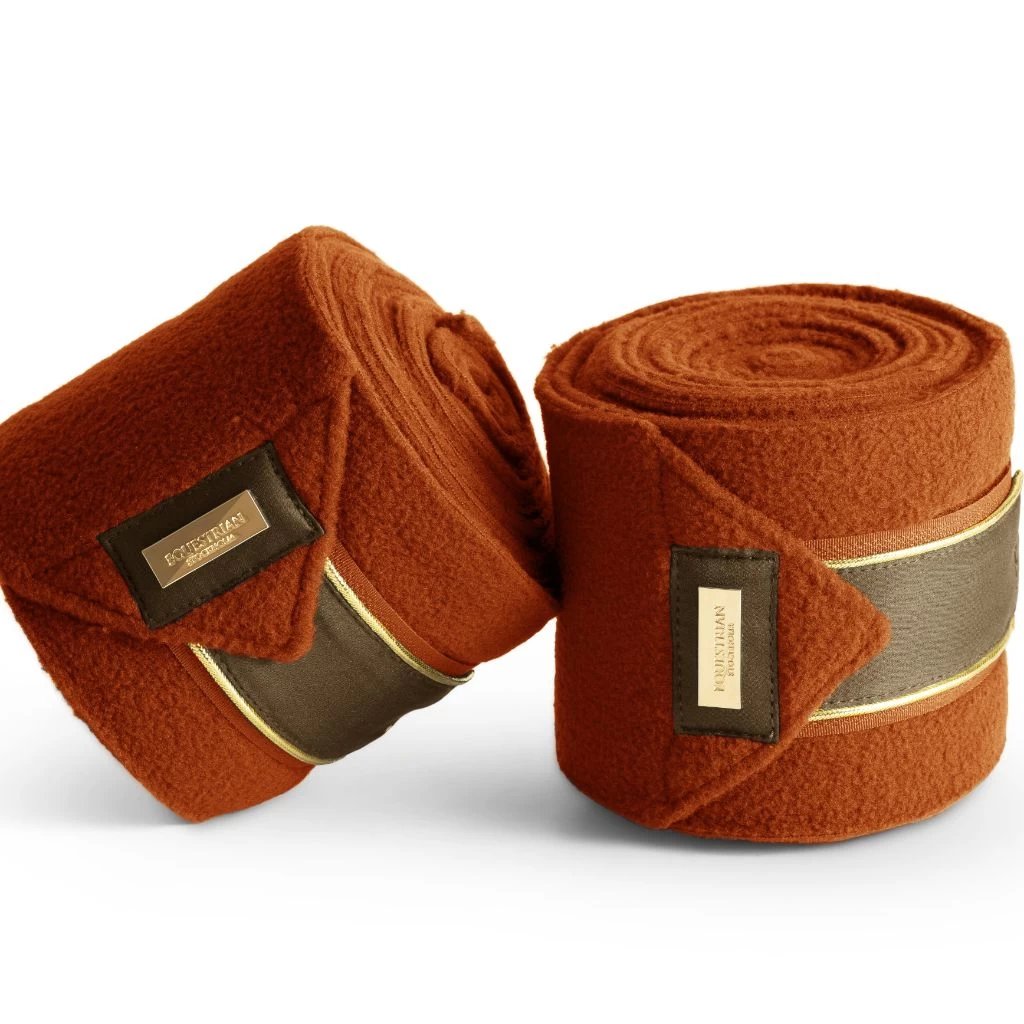 Exclusive fleece bandages in a warm orange design with golden details. Style with the saddle pad from the same collection to complete the elegant look. The fleece bandages are decorated with a gold Equestrian Stockholm badge. Sold in sets of four.