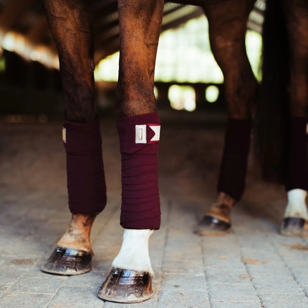 High quality fleece bandages in a romantic merlot nuance. Decorated with beige details and ES badge in gold. Style with the saddle pad and ear net from our Crystal Merlot Gold collection to complete the glamorous look. Sold in sets of four.