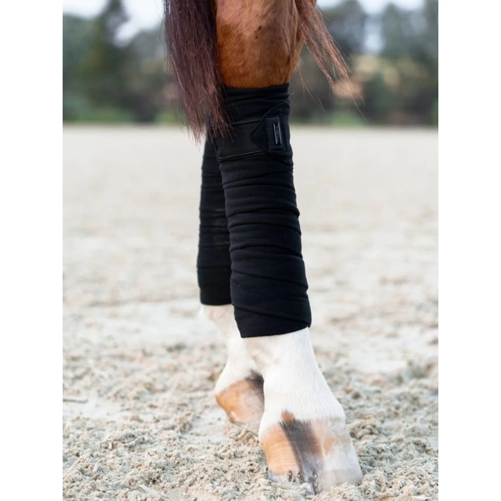 High quality fleece bandages in a stylish black color. Decorated with black satin details and an Equestrian Stockholm badge in black. Style with our saddle pad and ear net from the Total Eclipse collection to complete the glamorous look. Sold in sets of four.