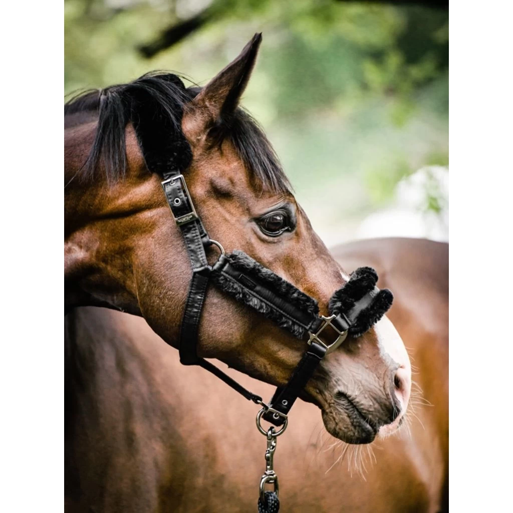 Fluffy and cozy halter with soft teddy fur. Designed in an elegant black color, with black teddy fur and chrome buckles. Decorated with the stylish Equestrian Stockholm badge in black and Equestrian Stockholm logo on the noseband. Style this with other pieces from the Total Eclipse collection for a head-to-toe stylish look.