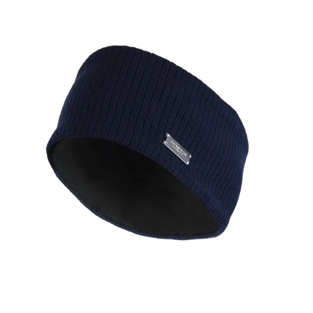 Stylish navy knitted headband with comfortable fleece lining and silver detail, perfect for cold days in the stable. Easy to style with every outfit!