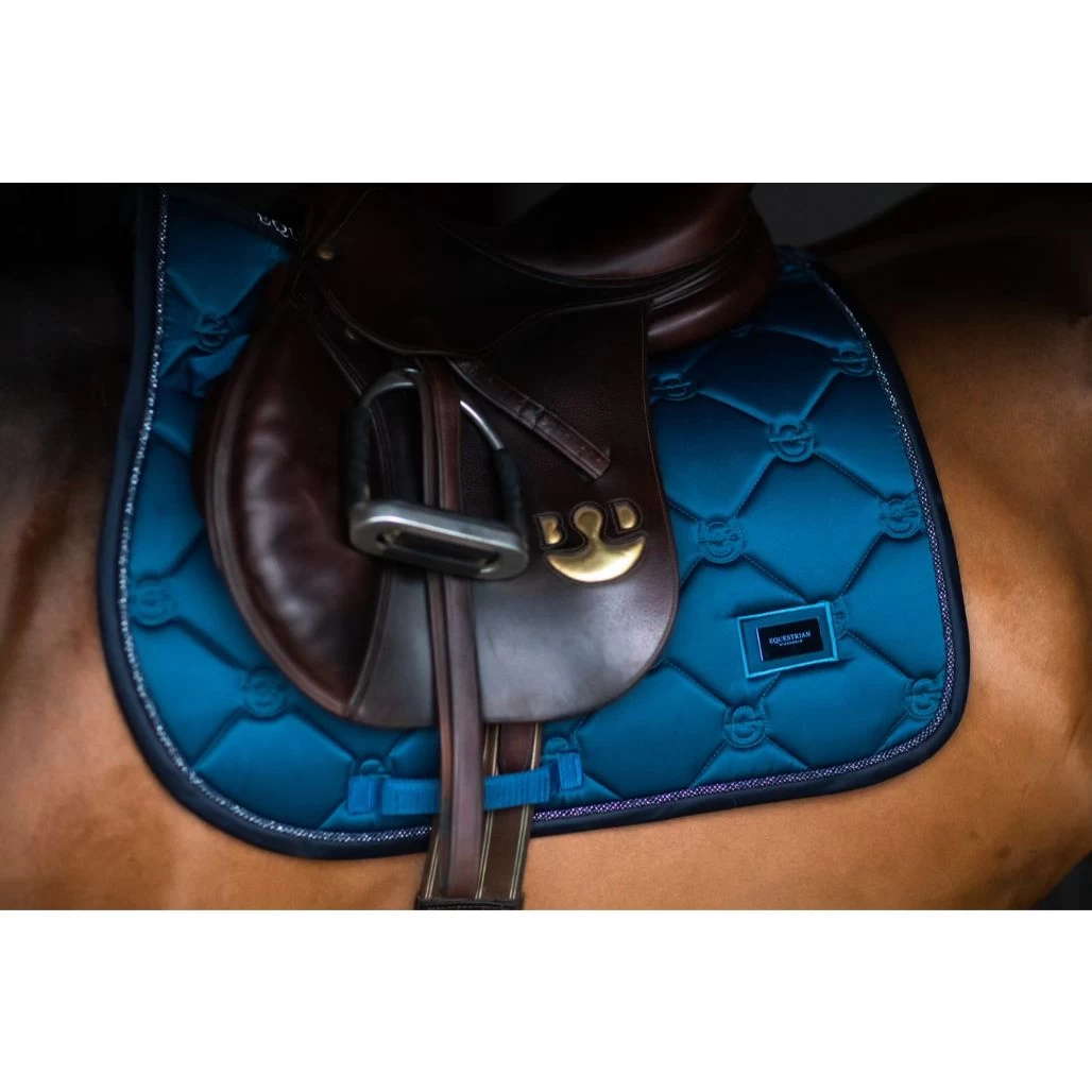 Elegant saddle pad in a blue colour with navy blue and blue metallic details. Decorated with the Equestrian Stockholm badge in dark blue. The bamboo material is perfect all year round due to its thermal regulating effect – cooling in the Summer and warming in the Winter. It is also quick dry, moisture wicking, and anti-bacterial. Style with other pieces from the Blue Meadoow collection for a head-to-toe stylish look.
