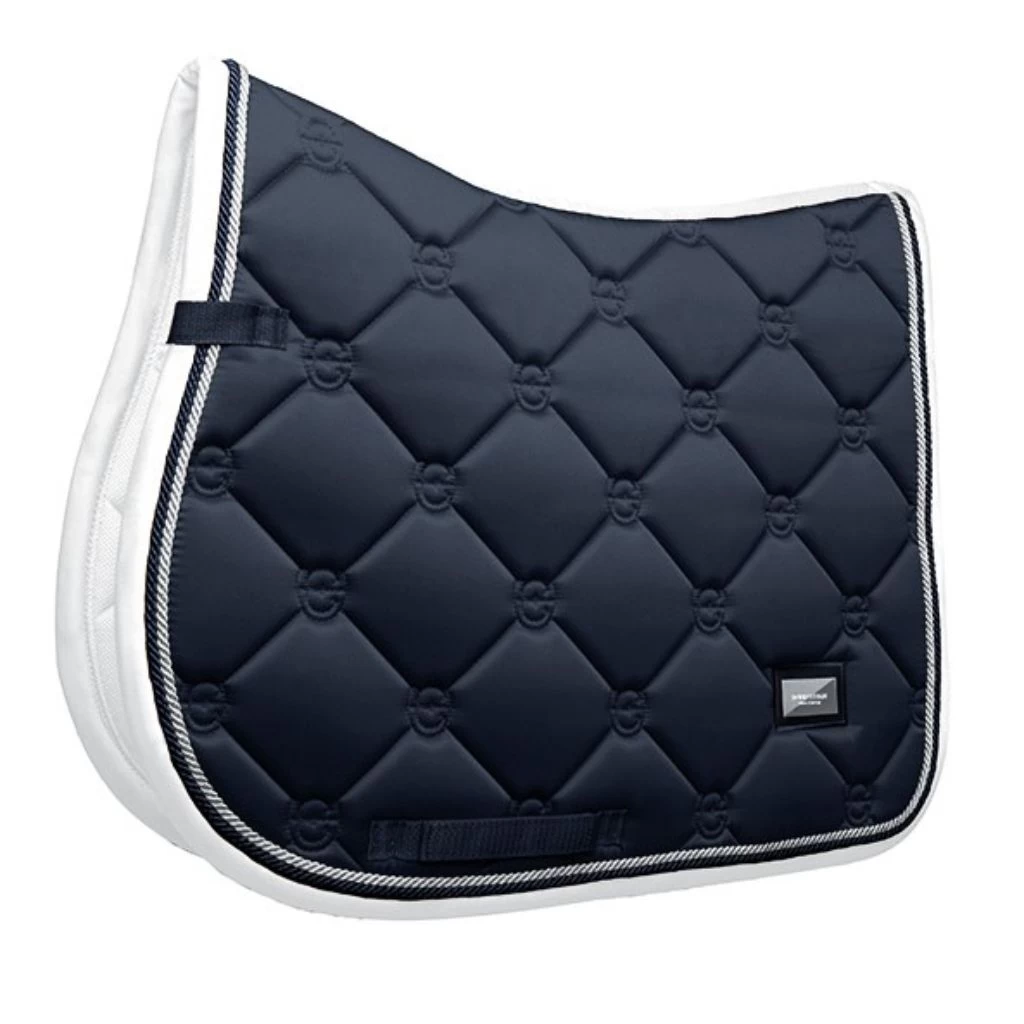 Our luxury dressage saddle pad in shiny navy with navy/white piping is perfect for a day of training.
