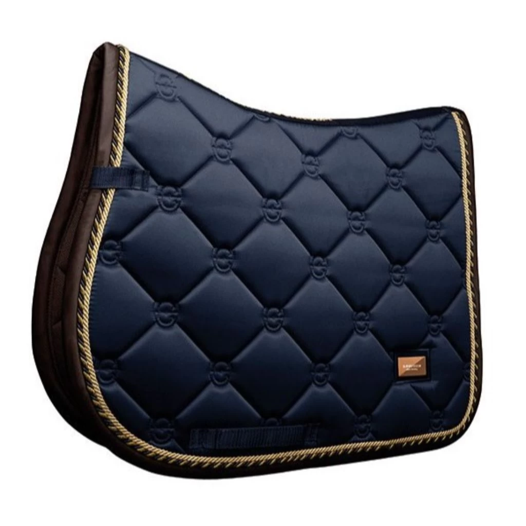Our luxury jumping saddle pad in shiny navy is perfect for competitions or a day of training.