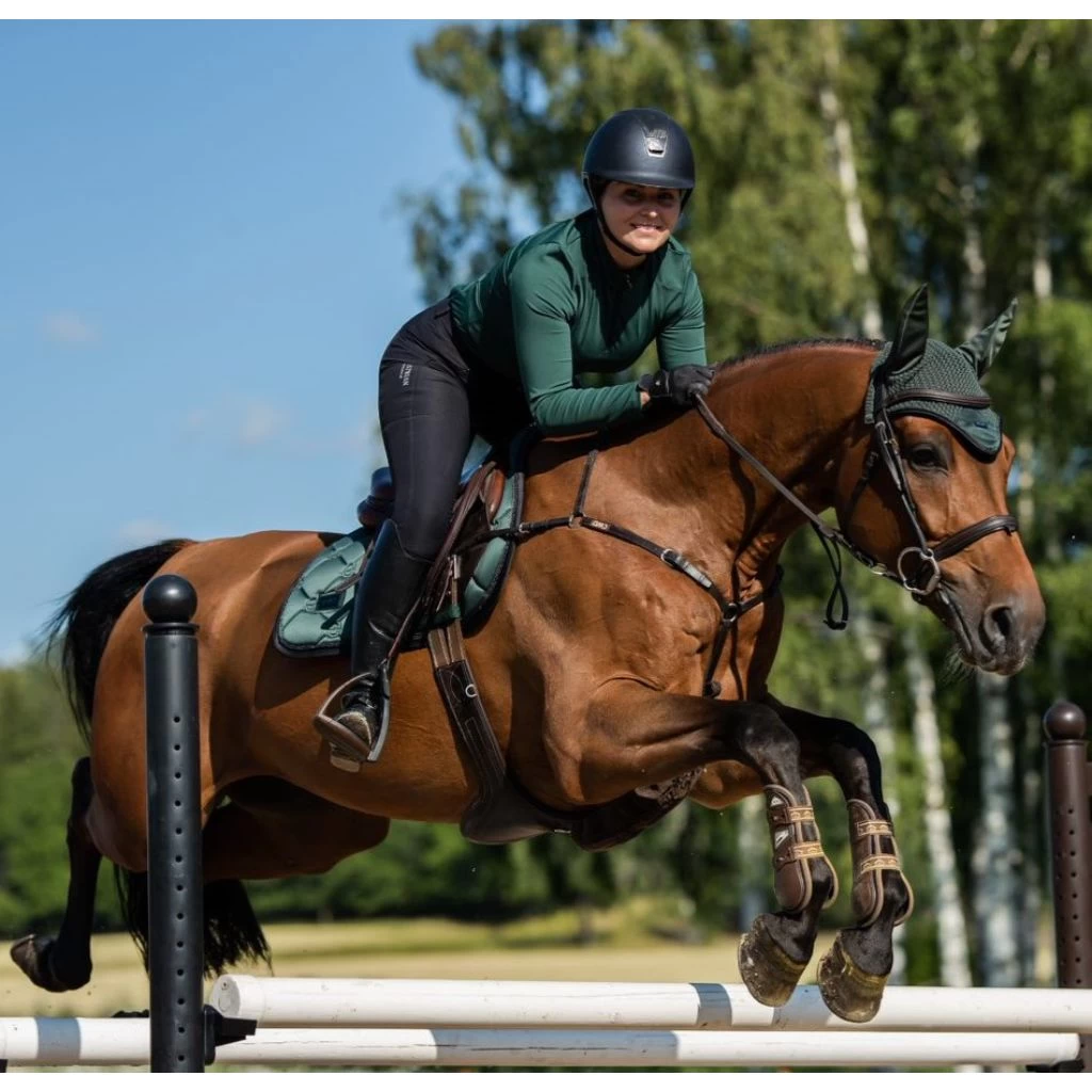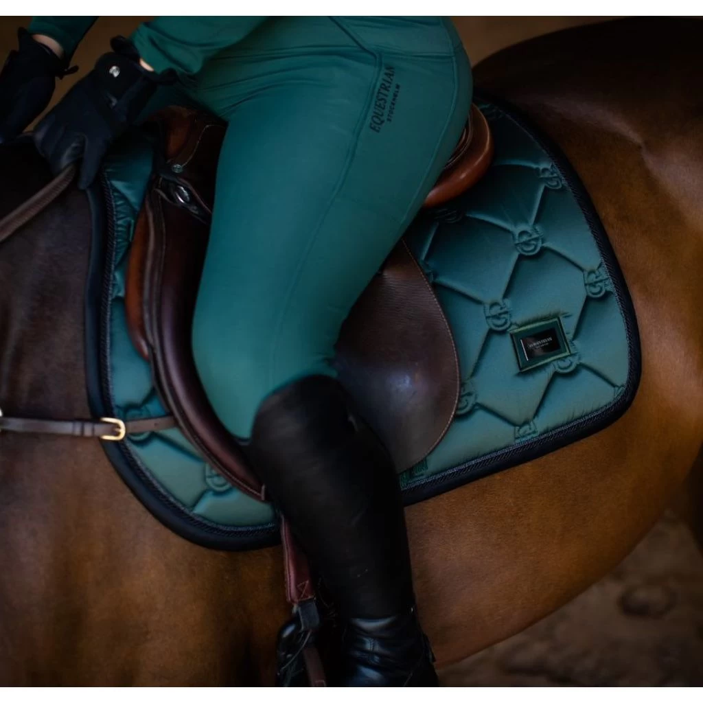 Elegant saddle pad in a cool dark green colour with black and chrome details. Decorated with the Equestrian Stockholm badge in black. The bamboo material is perfect all year round due to its thermal regulating effect – cooling in the Summer and warming in the Winter. It is also quick dry, moisture wicking, and anti-bacterial. Style with other pieces from the Sycamore Green collection for a head-to-toe stylish look.