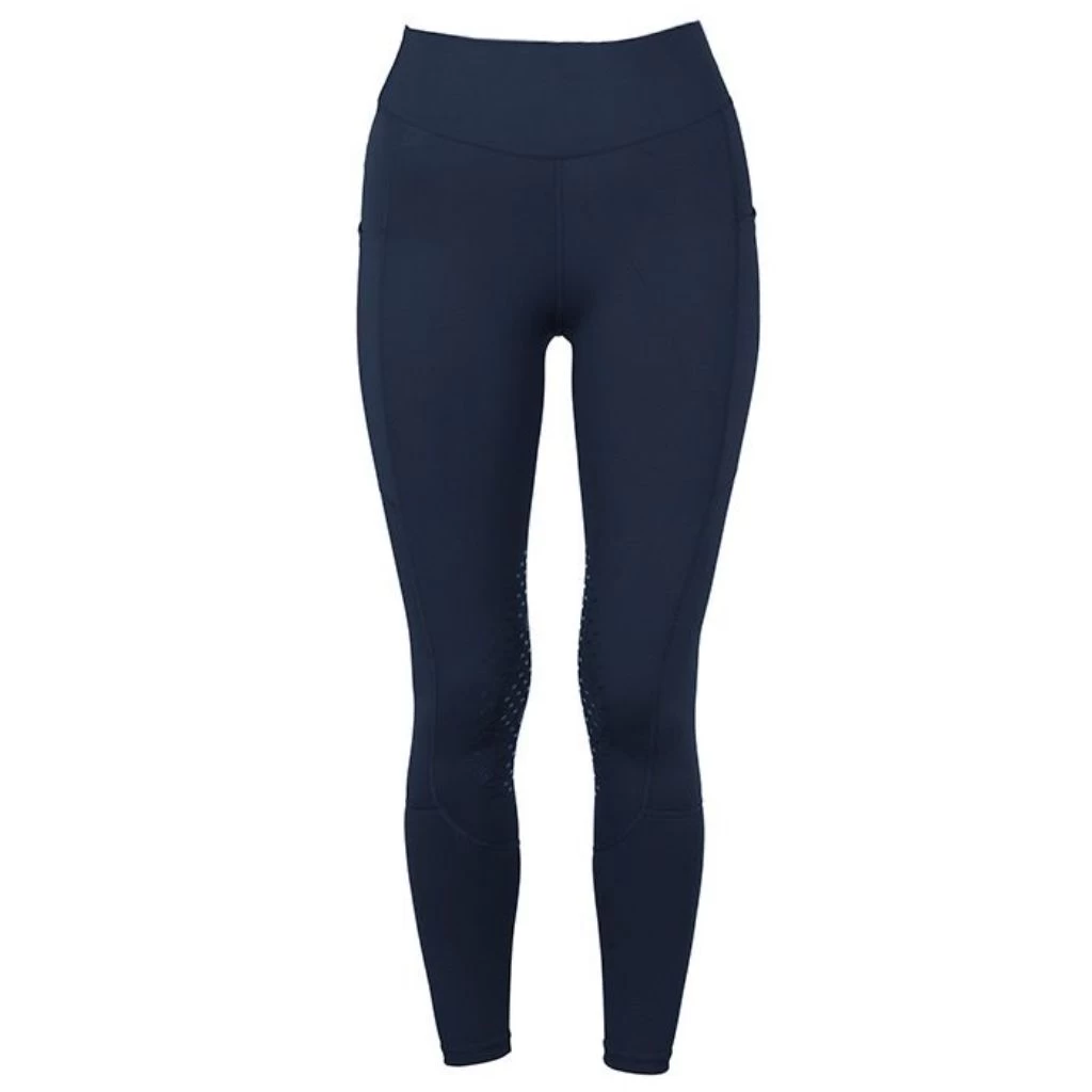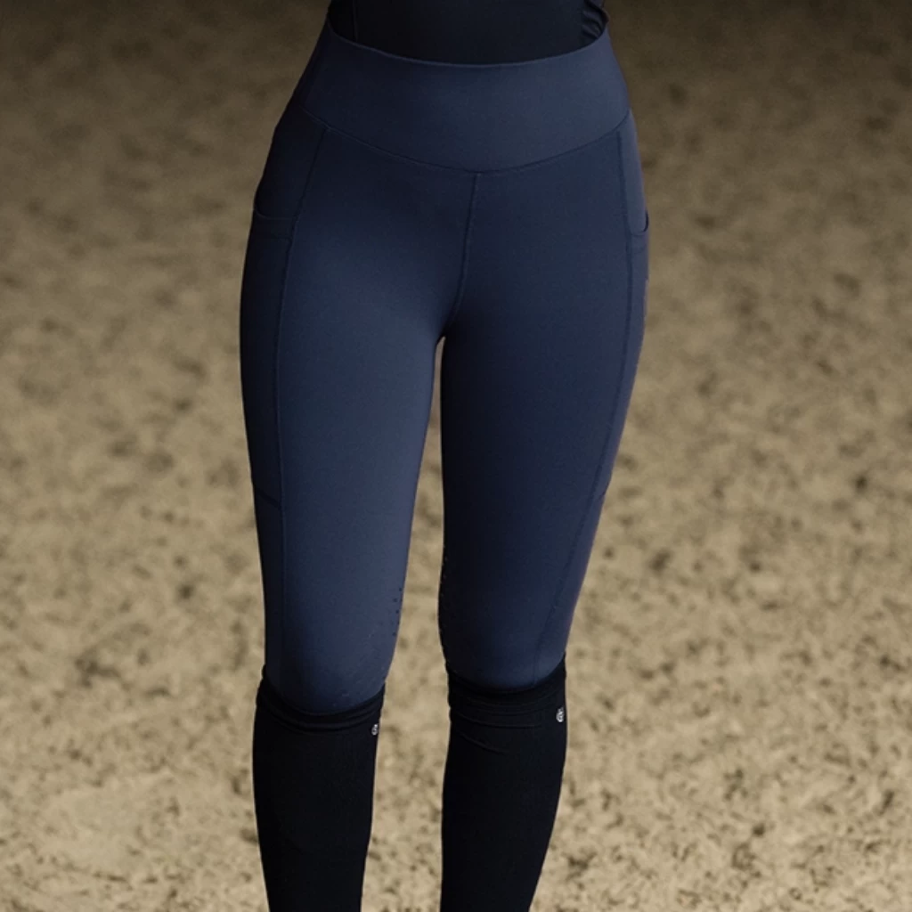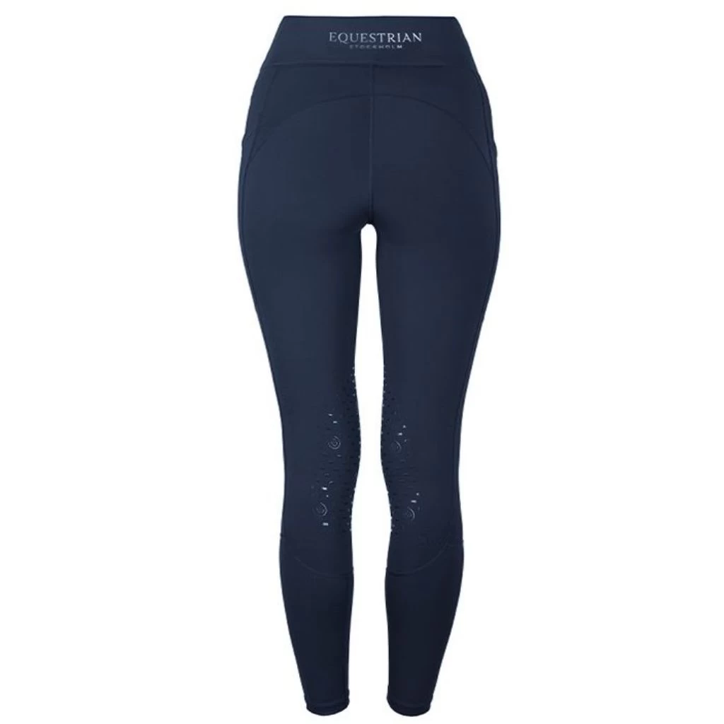 This design is meant to ensure that the rider can move freely and comfortably, while also receiving the necessary support to help them perform at their best. The Equestrian Stockholm Riding Tights Jump Movement come in a beautiful navy blue color and equipped with large side pockets on both sides, making it easy to store a phone. The Equestrian Stockholm Riding Tights Jump Movement are decorated with a silver printed ES logo on the left pocket and a beautiful silver printed Equestrian Stockholm logo on the center of the waistband.