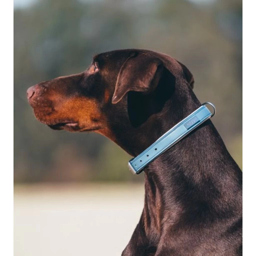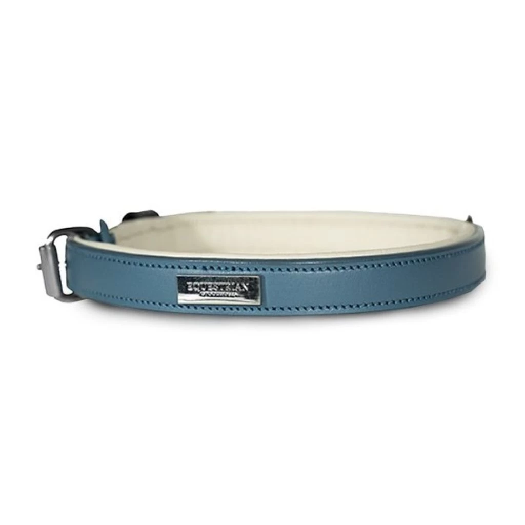 Elegant and comfortable dog collar in a beautiful stone blue. Soft padding on the inside in a beige color. Decorated with an Equestrian Stockholm badge in silver. The collar is available in several sizes to fit both small and large dogs.