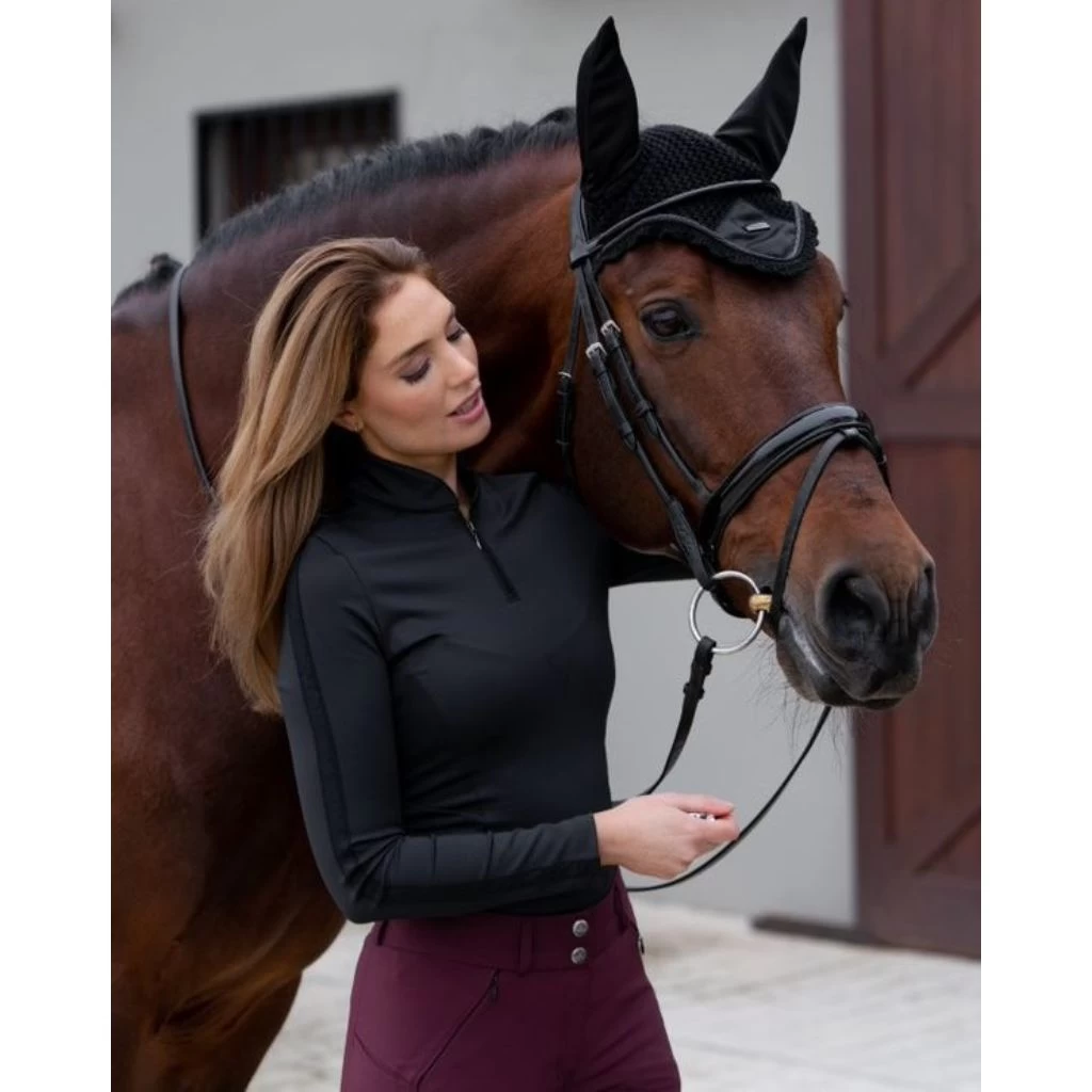 Our Power Top in black is designed to make you feel unstoppable! The top is made of recycled polyester, is breathable and feels soft and comfortable all day. Decorated with a tone on tone Equestrian Stockholm Power woman logo on both sleeves, on the back and on the collar. Wear it with other products from the same collection for a complete look! The top comes in a wide size range to fit you perfectly.