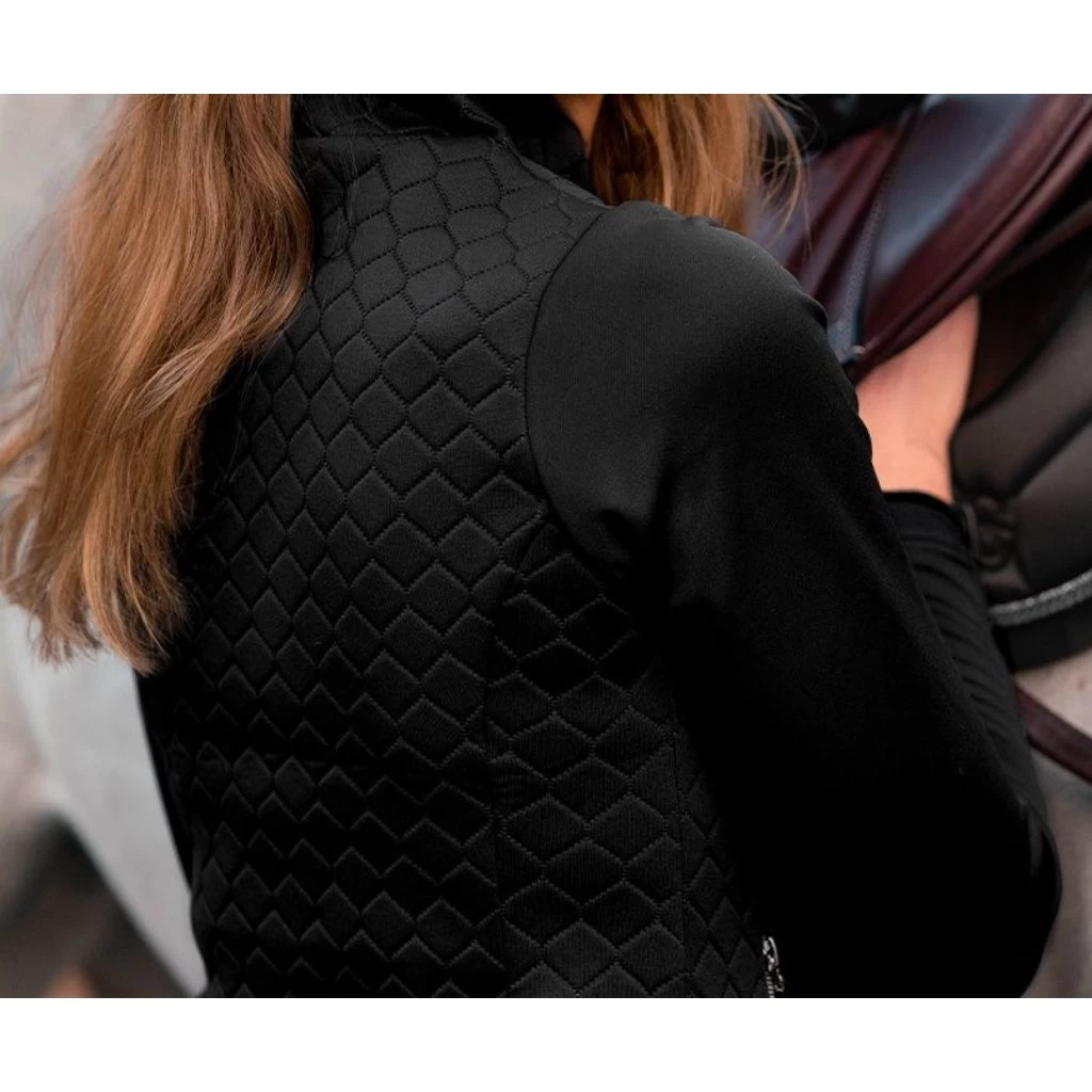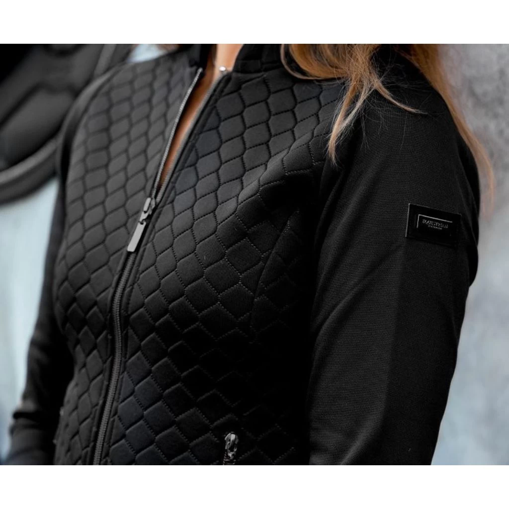 Exclusive and sporty black jacket in a stretchy fabric with silver details. The sleeves are in a glossy, dirt-repellent outer material and the inside is in comfortable thin fleece. The material contains coffee grounds which works as an odor control. This function keeps your jacket fresh longer, which could mean fewer washes. This means less wear on the jacket as well as the planet. Wear it with other products from Equestrian Stockholm for a complete look! The jacket comes in a wide size range to fit you perfectly.