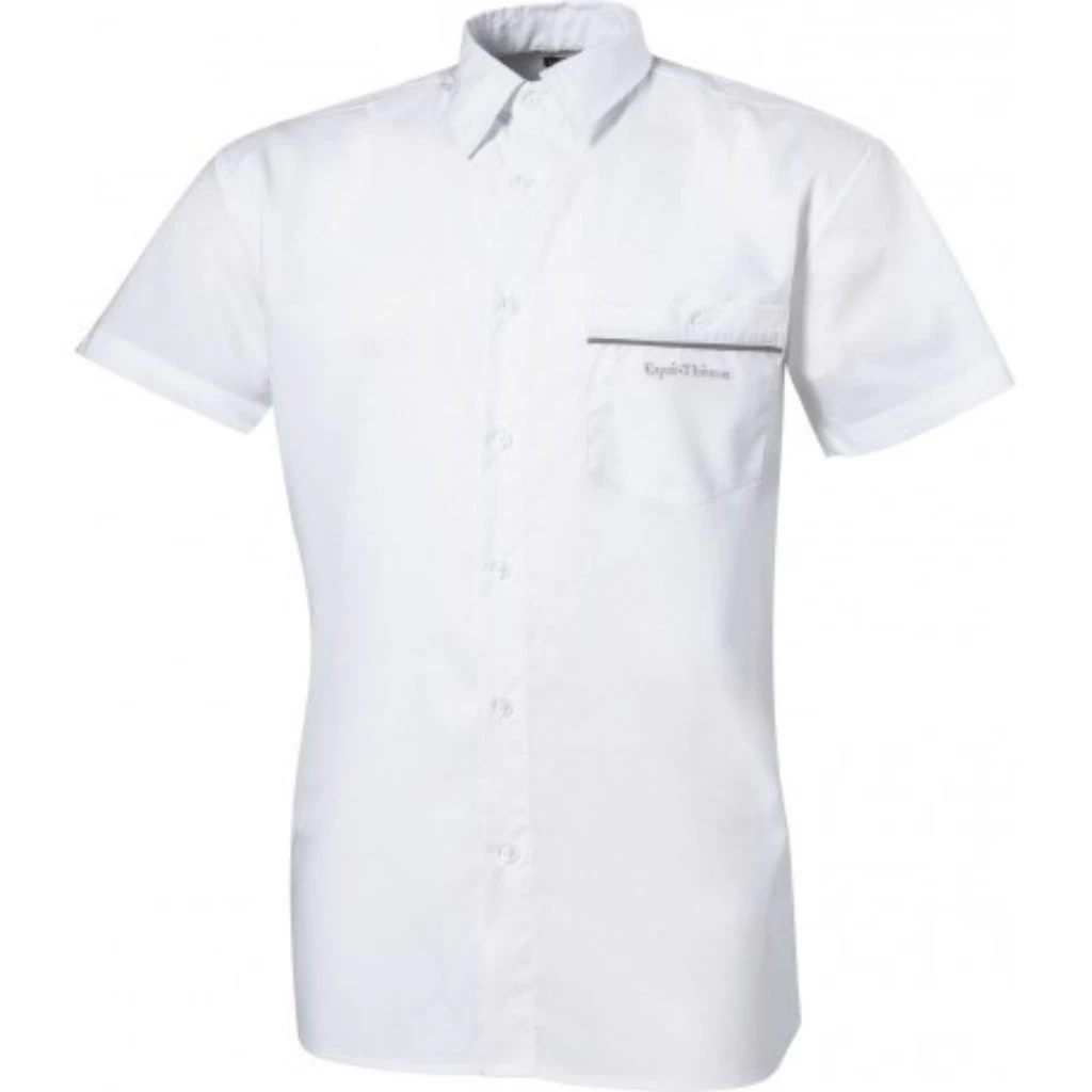Features a chest pocket enhanced with white piping and a contrasted Equi-Theme embroidery with an official white collar and button closure.