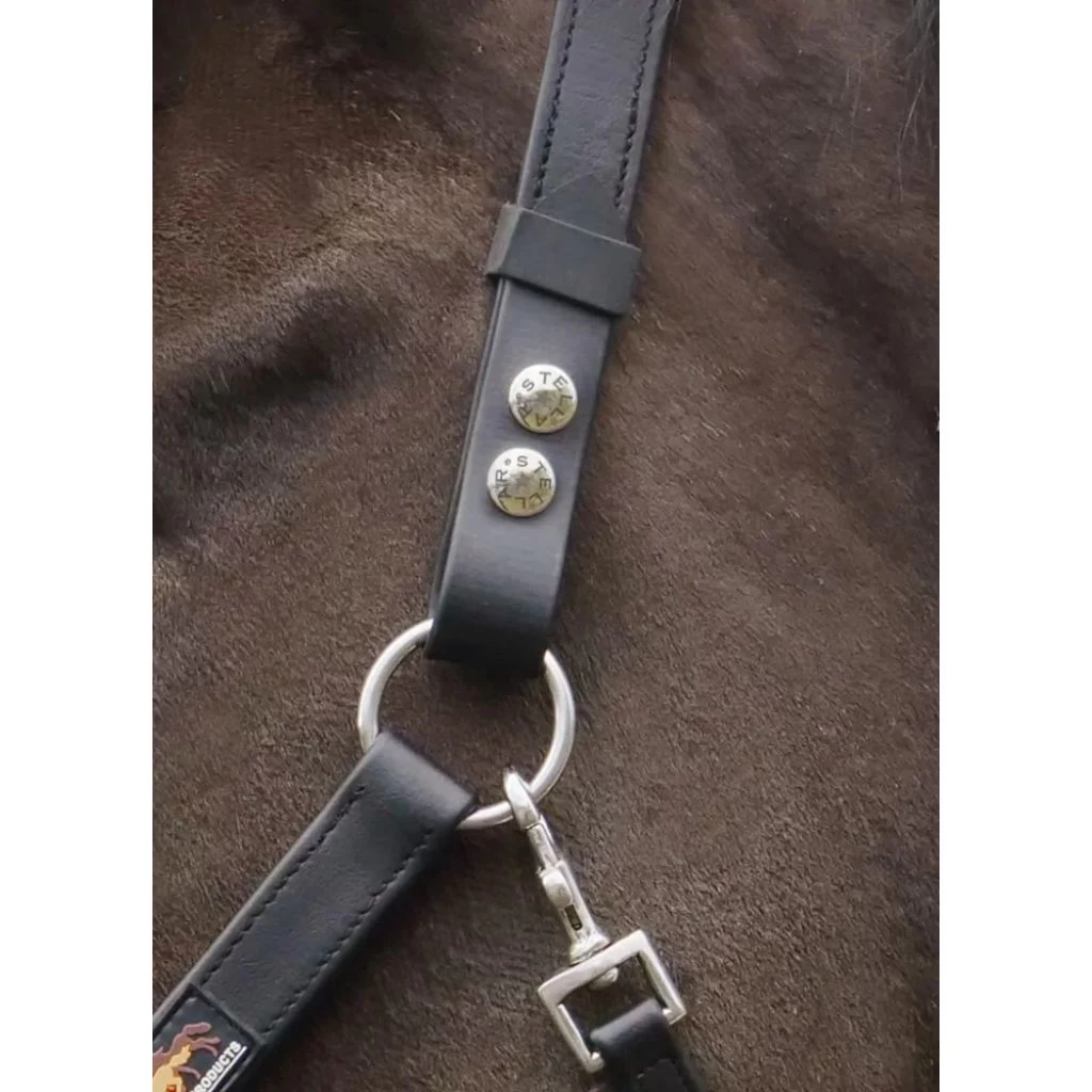 Click the stud fasteners on the headpiece firmly shut, before sliding the keeper over the end of the headpiece as illustrated. The keeper must ALWAYS be over the end for the release system to work as intended. Only one stud fastener needs to be attached on each side of the headpiece, however you will notice on the product there are several fasteners. This gives you options for some adjustability in the headcollar. Where possible, undo the throatlatch area and slide the headpiece over your horses’ head to put the headcollar on and off to prolong the life of the stud fasteners.