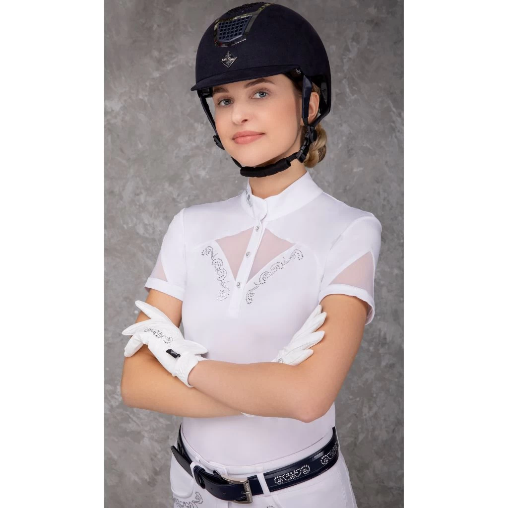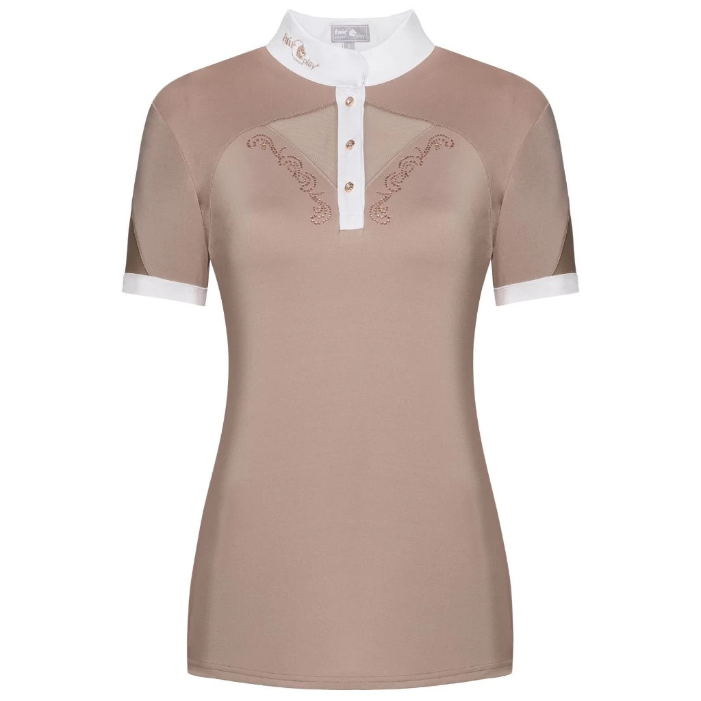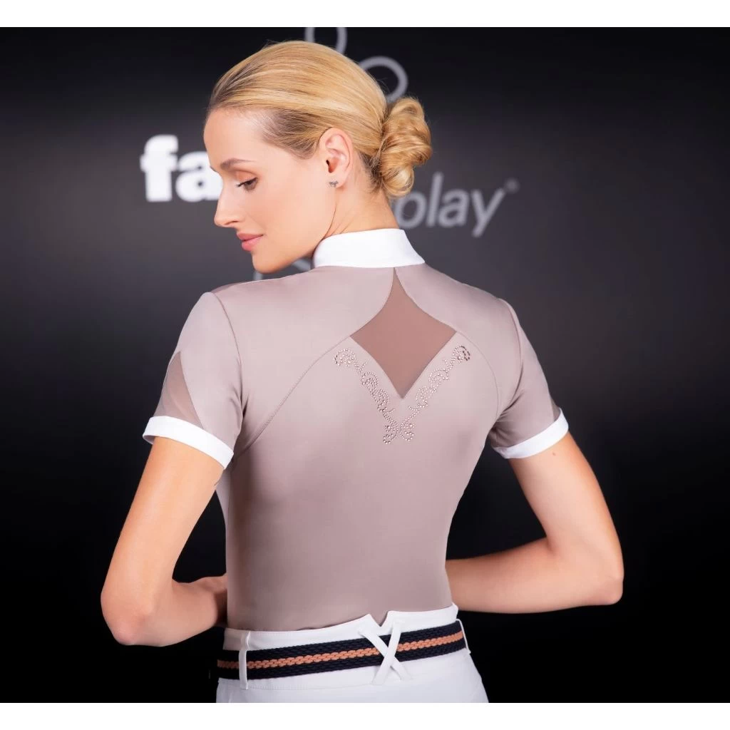New FairPlay Cathrine competition shirt in White and Taupe. This elegant show shirt is exceptionally femenine and creates presence with or without a jacket over top.