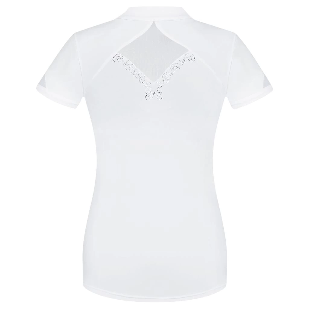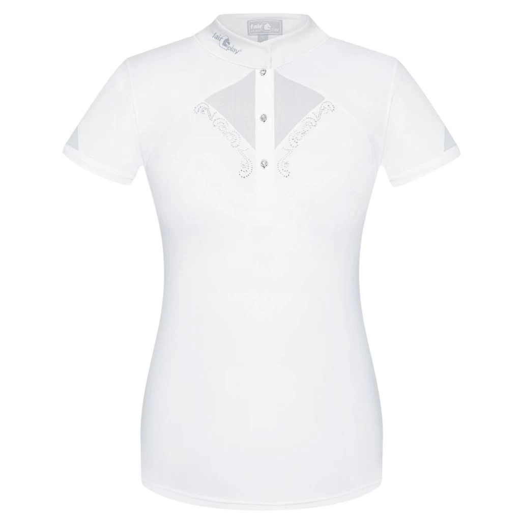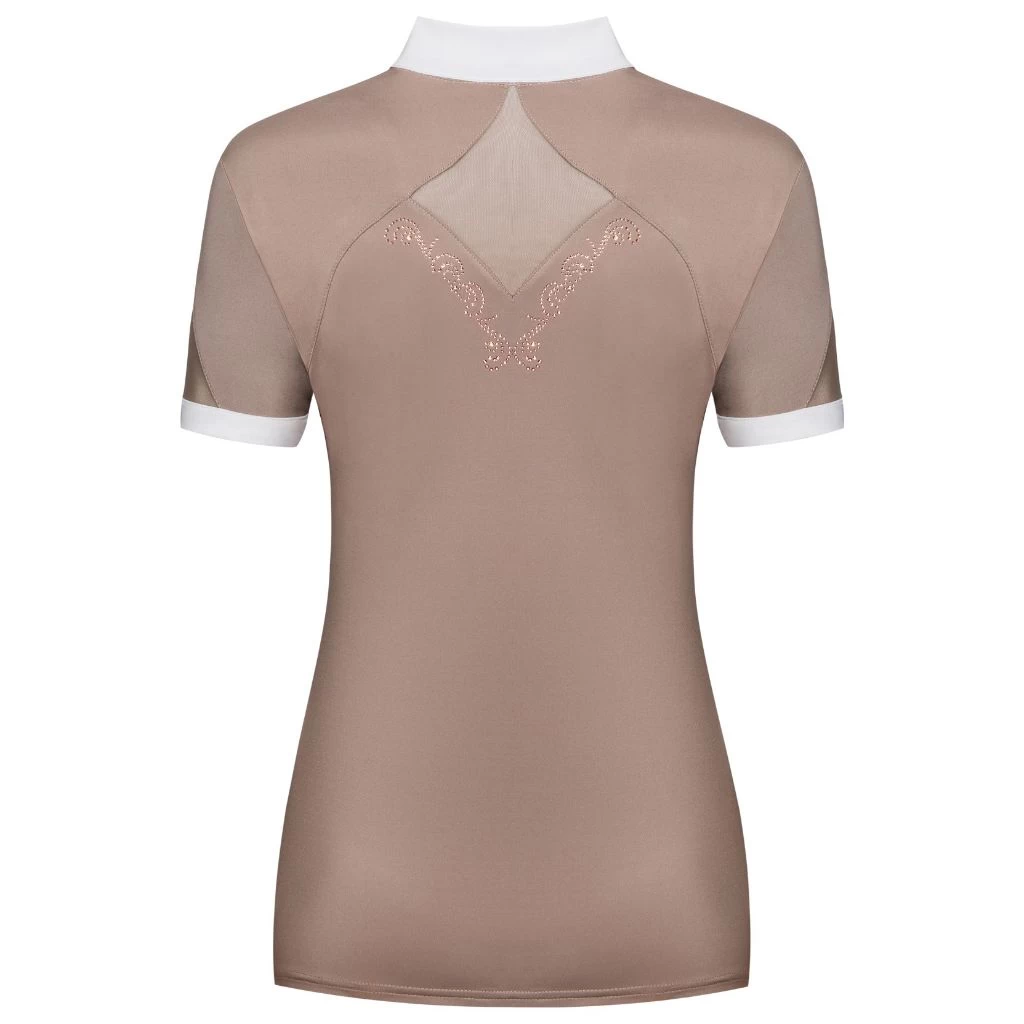 New FairPlay Cathrine competition shirt in White and Taupe. This elegant show shirt is exceptionally femenine and creates presence with or without a jacket over top.
