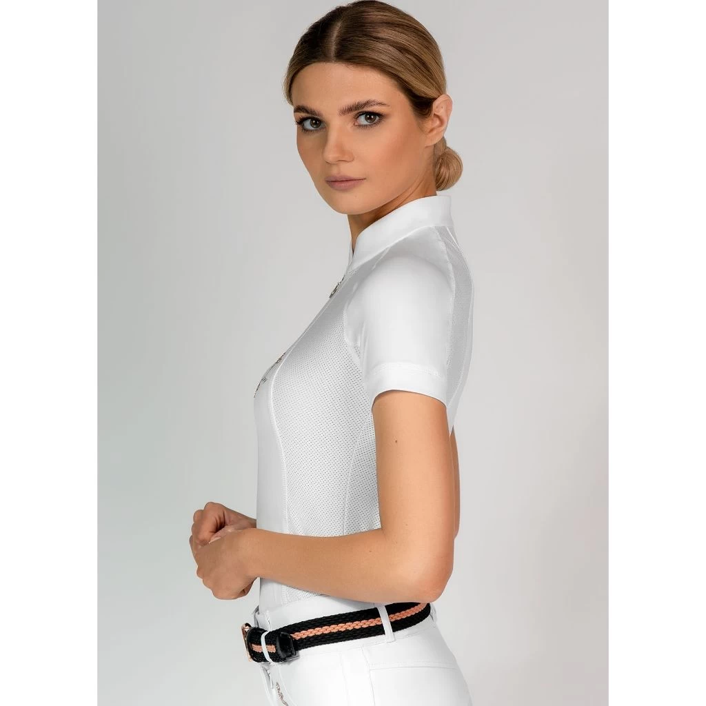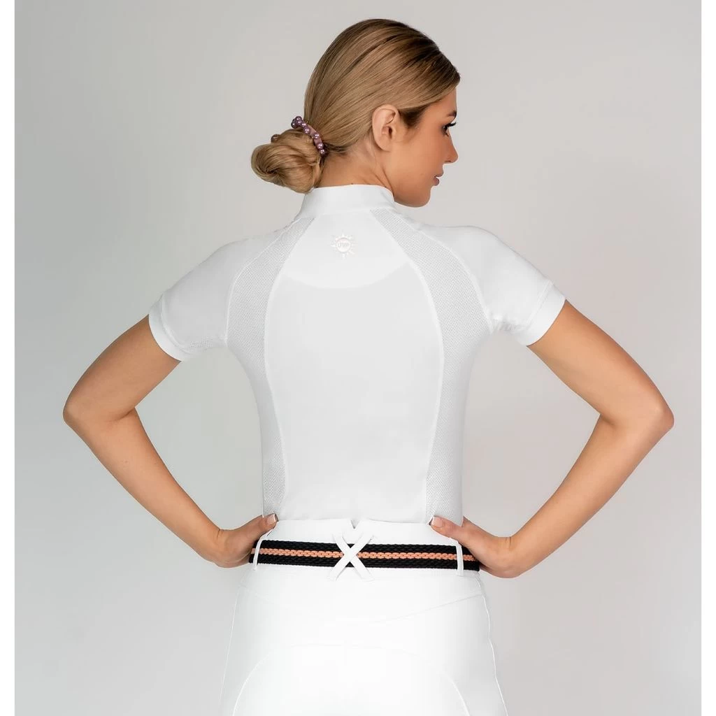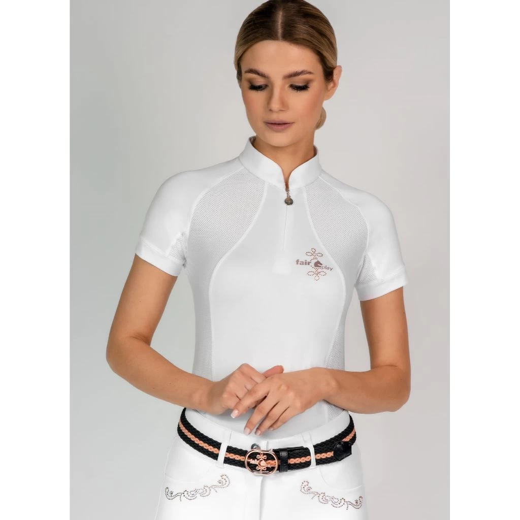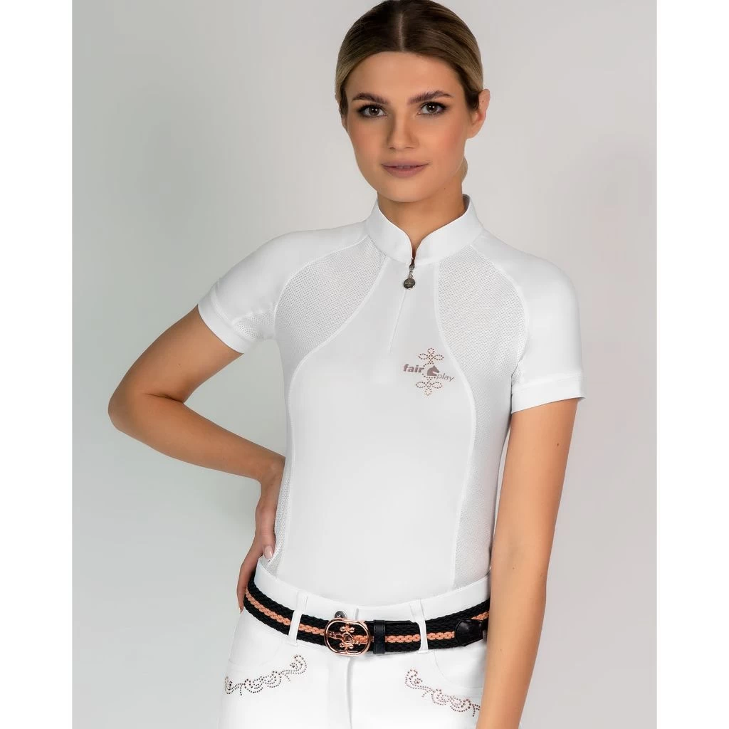 The simple yet elegant FairPlay Paula now in a short sleeve top! Features UV protection making it perfect for riding in all year around, especially in the warmer months. Sporty mesh sides ensure breathability, a rose gold FairPlay logo on the front chest adds detail and available in white and burgundy.