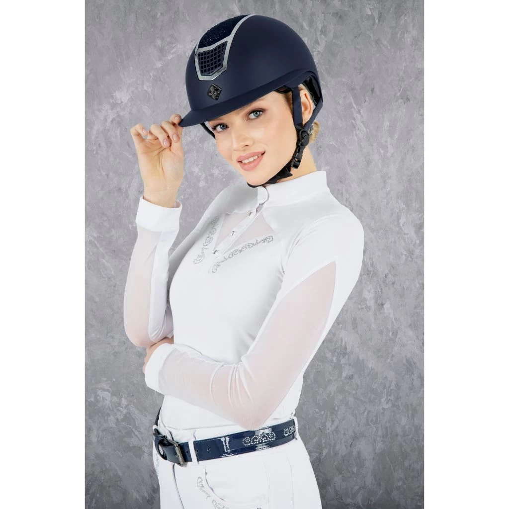 Excellent fitting helmets with pretty crystal pattern on the top, wide peak and Fairplay logo.