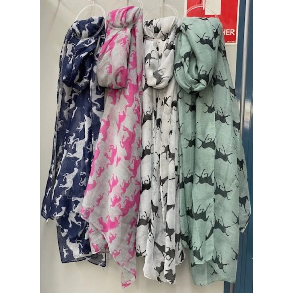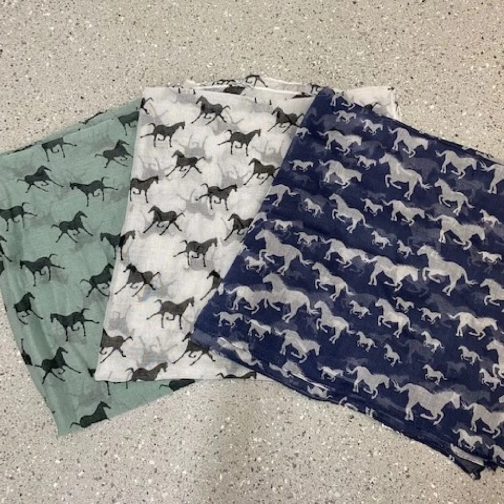 Super light weight, elegant and easy to wear with anything! A beautiful horsey theme scarf for anyone.