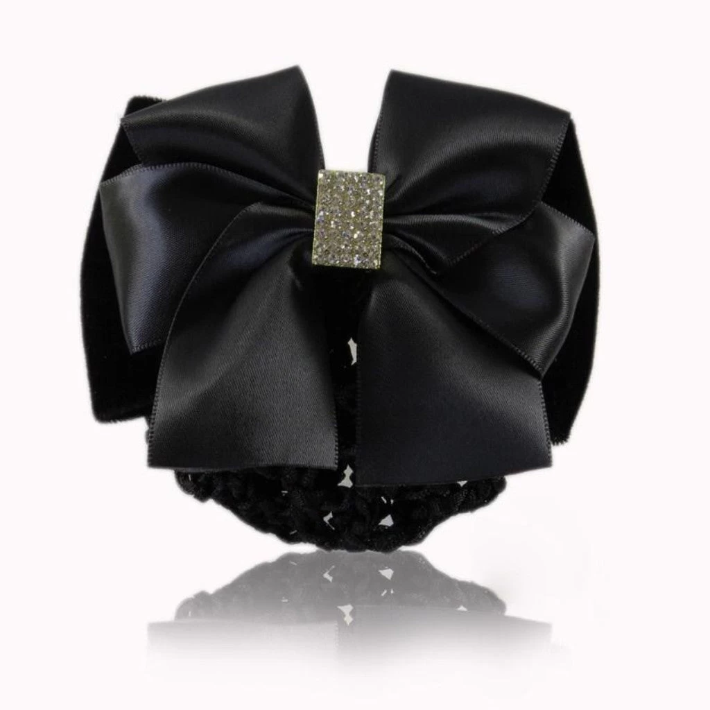 Hairclip with hair net featuring a crystal bar, velvet backing and satin bow.Â