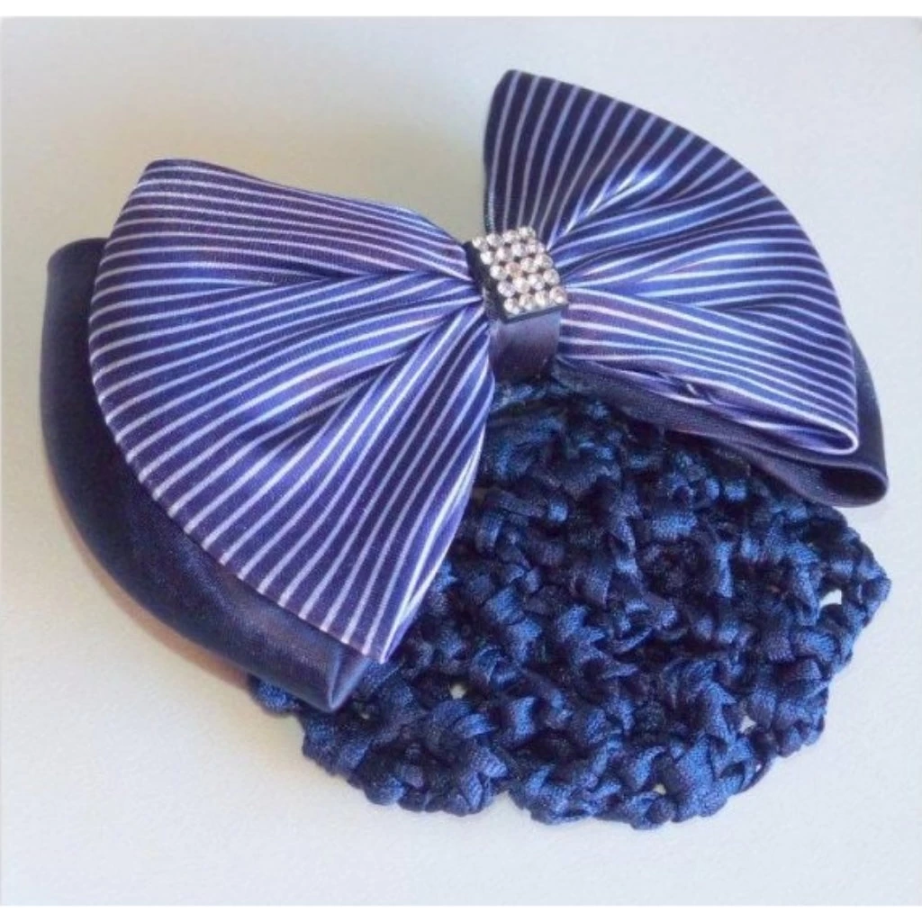 Hairclip with hairnet featuring a striped satin bow and crystal bar.