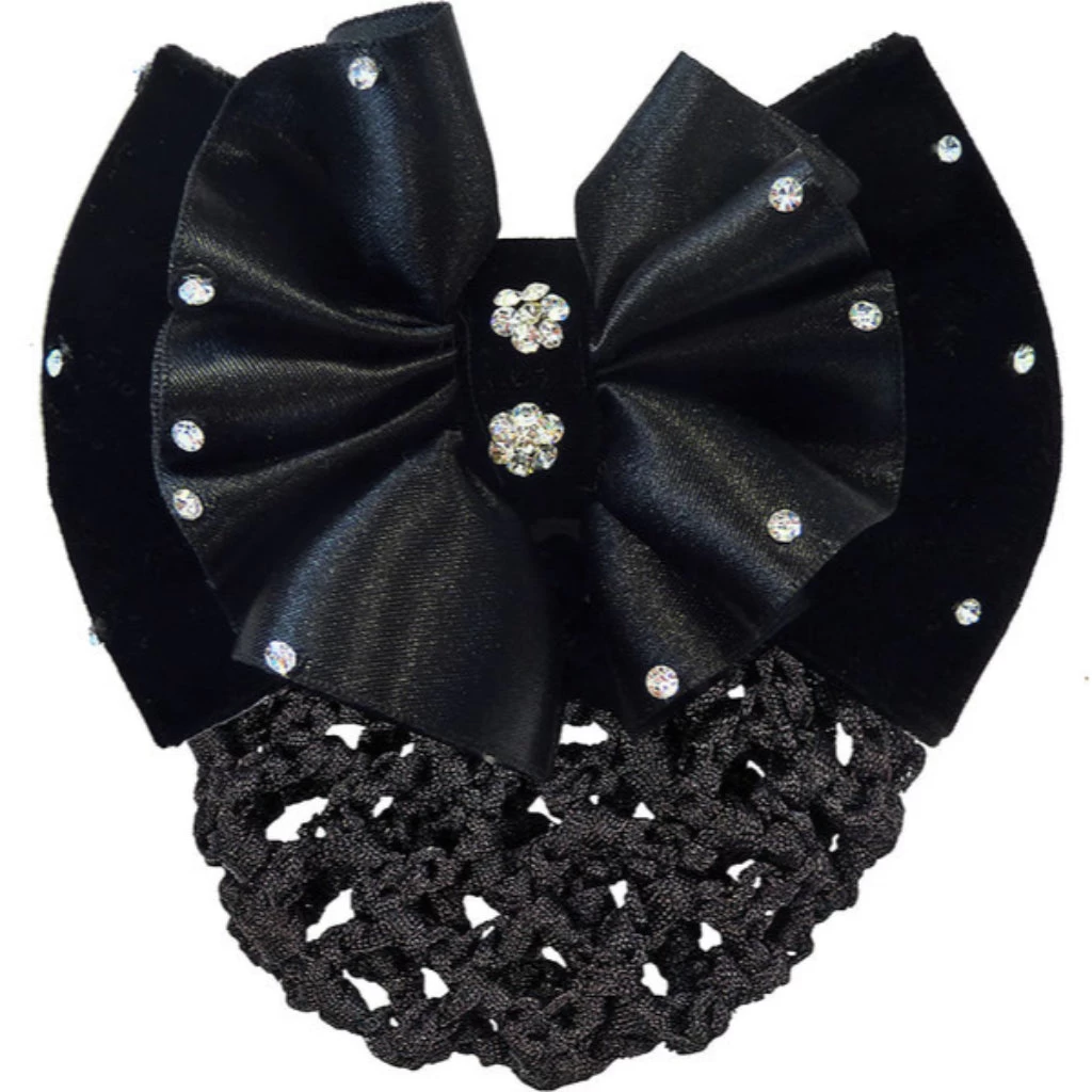 Hairclip with polyester hairnet decorated with a double velvet and satin bow inlaid with clear strass and featuring a velvet ring enhanced with flower-design crystals.