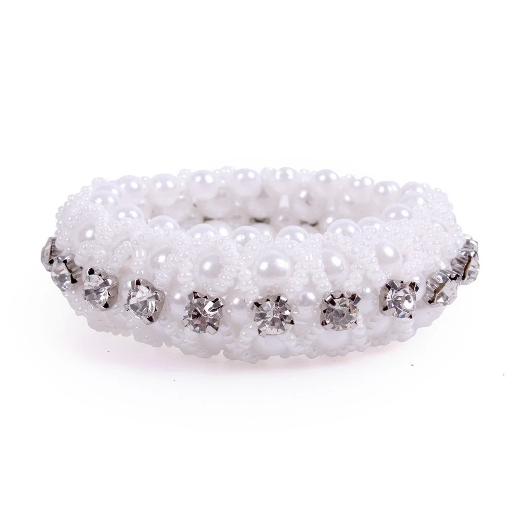 Elastic scrunchie with many beads in different sizes, interspaced with large silver rhinestones.