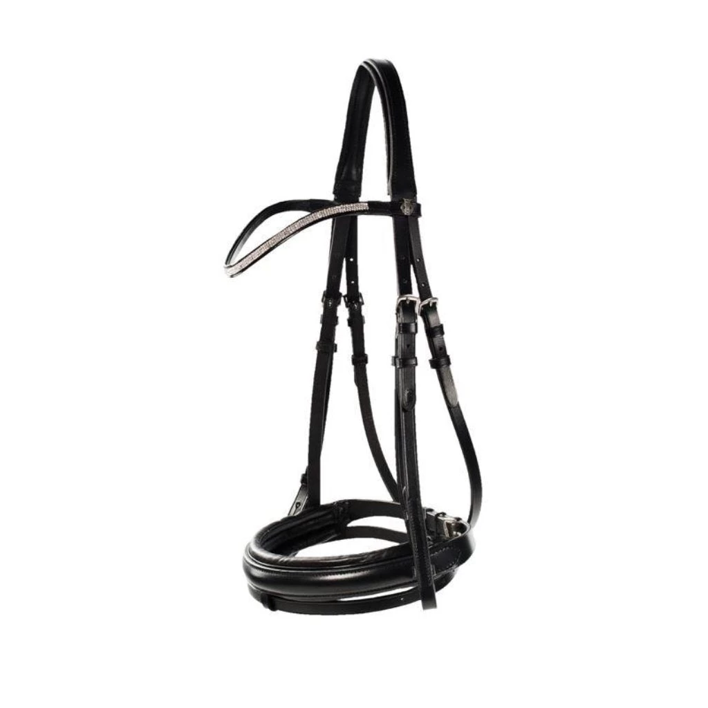 The U-shaped crystal-covered brow band provides elegant sparkle on this finely-crafted flash bridle.