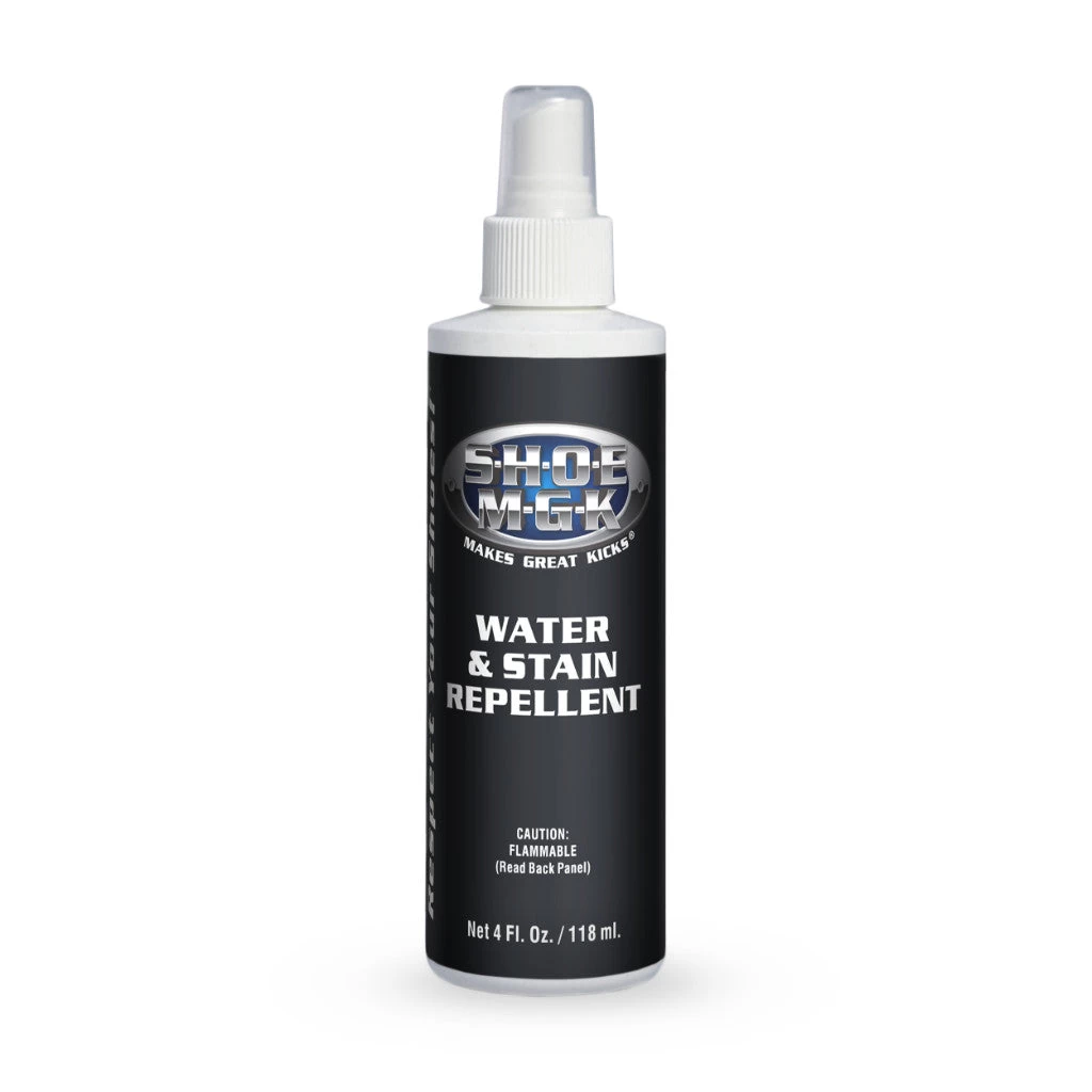 The “Shoe M-G-K” Water & Stain Repellent protects suede, nubuck, fine leather, fabrics, nylon and other materials from water stain causing agents.