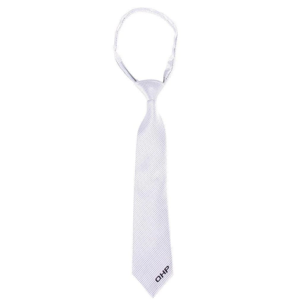 The tie has a diagonal dotted pattern and a QHP embroidery at the bottom.