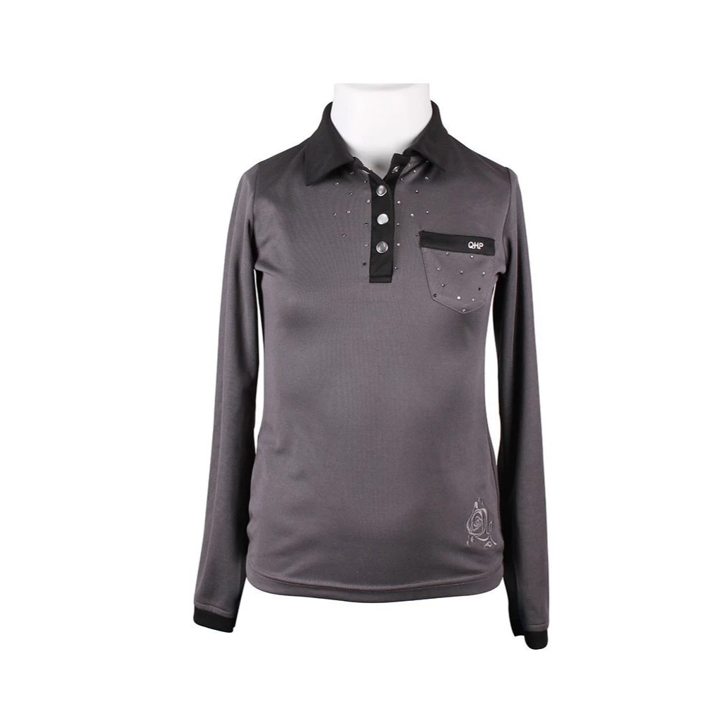 Light grey and white competition shirt, with embroidered lines and rhinestones in different shades of grey. A perfect match for the sporty Lisa Breeches